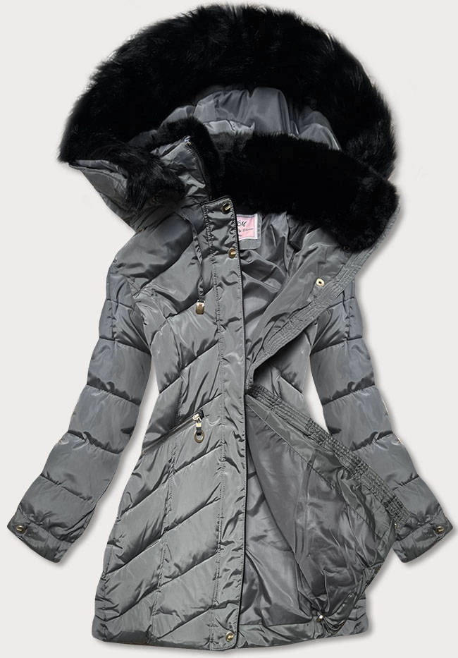 Długa damska kurtka zimowa z kapturem szara (7688)
