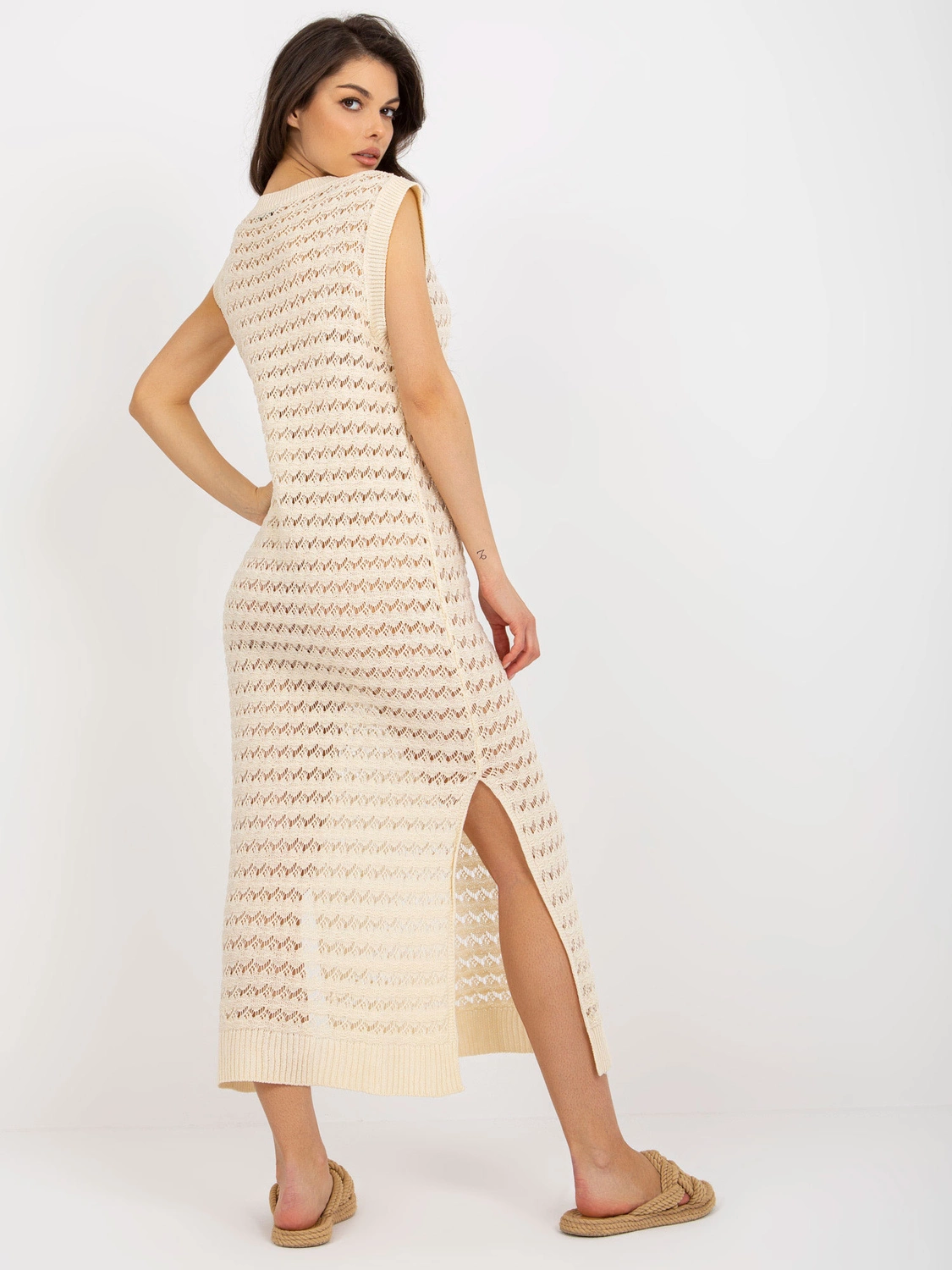 Prosta sukienka z okrągłym dekoltem beżowa (655)