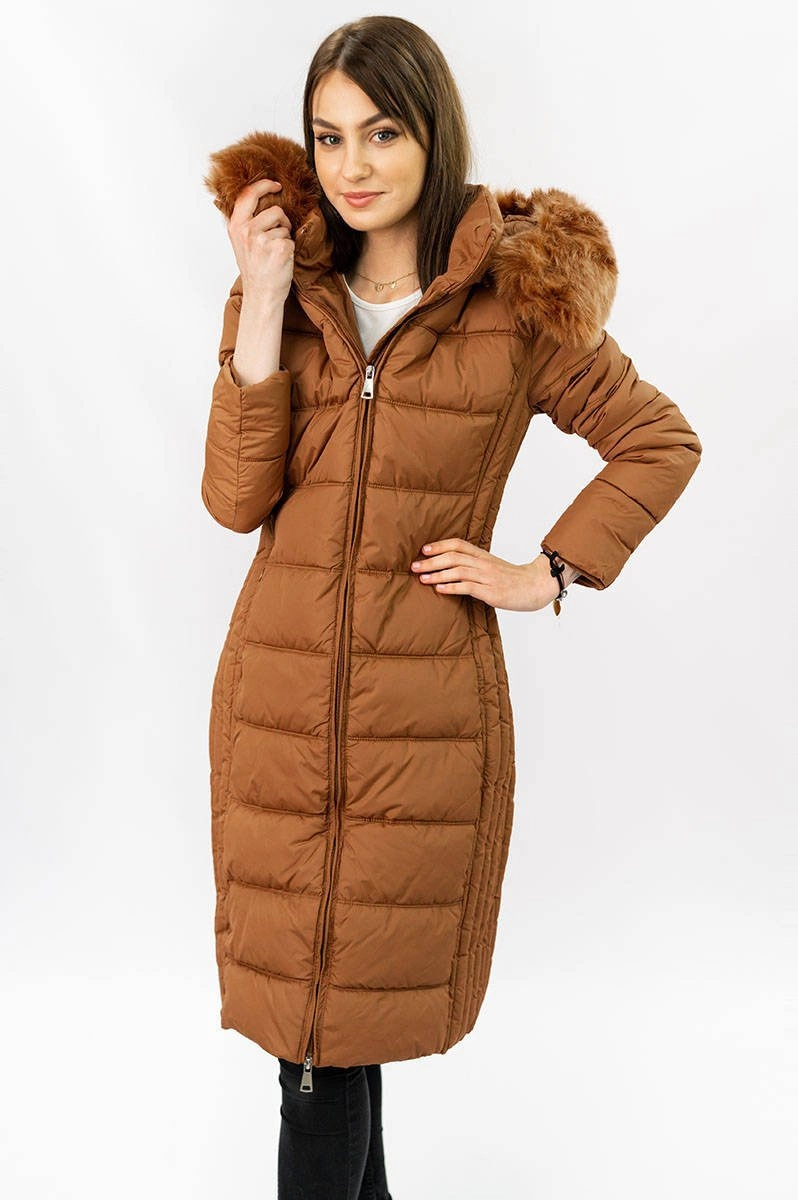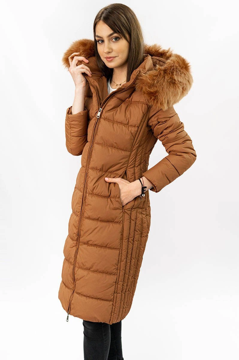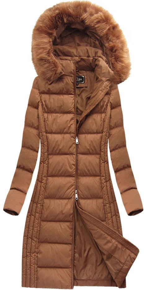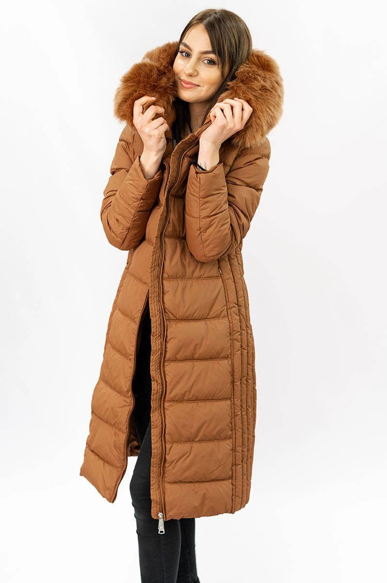 DŁUGA KURTKA DAMSKA ZIMOWA Z KAPTUREM KARMELOWA (7753)