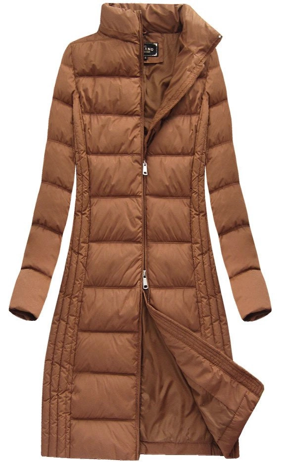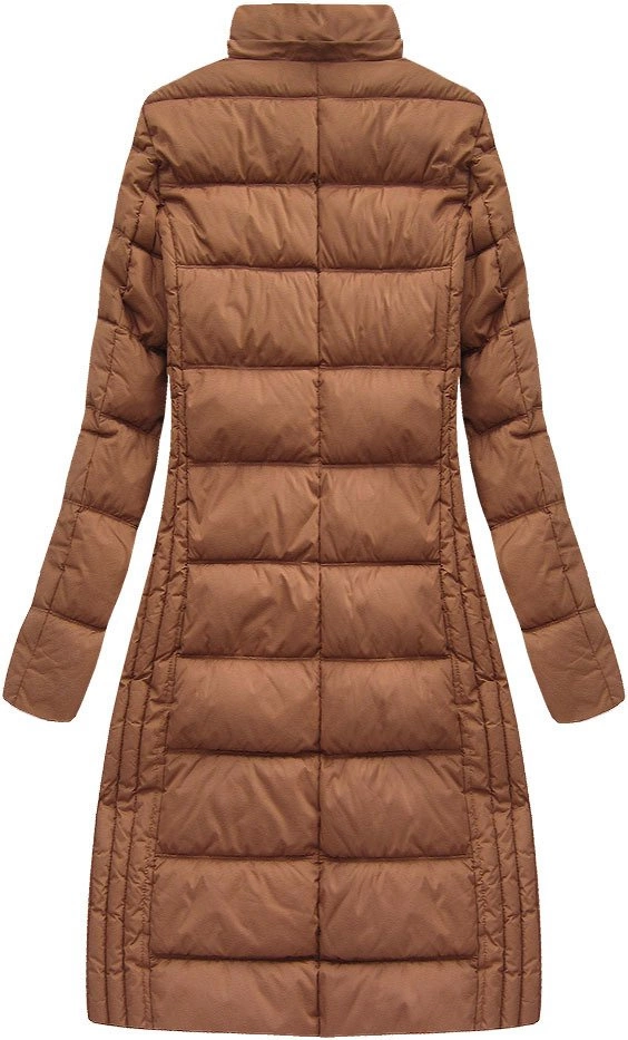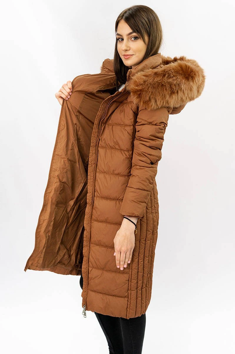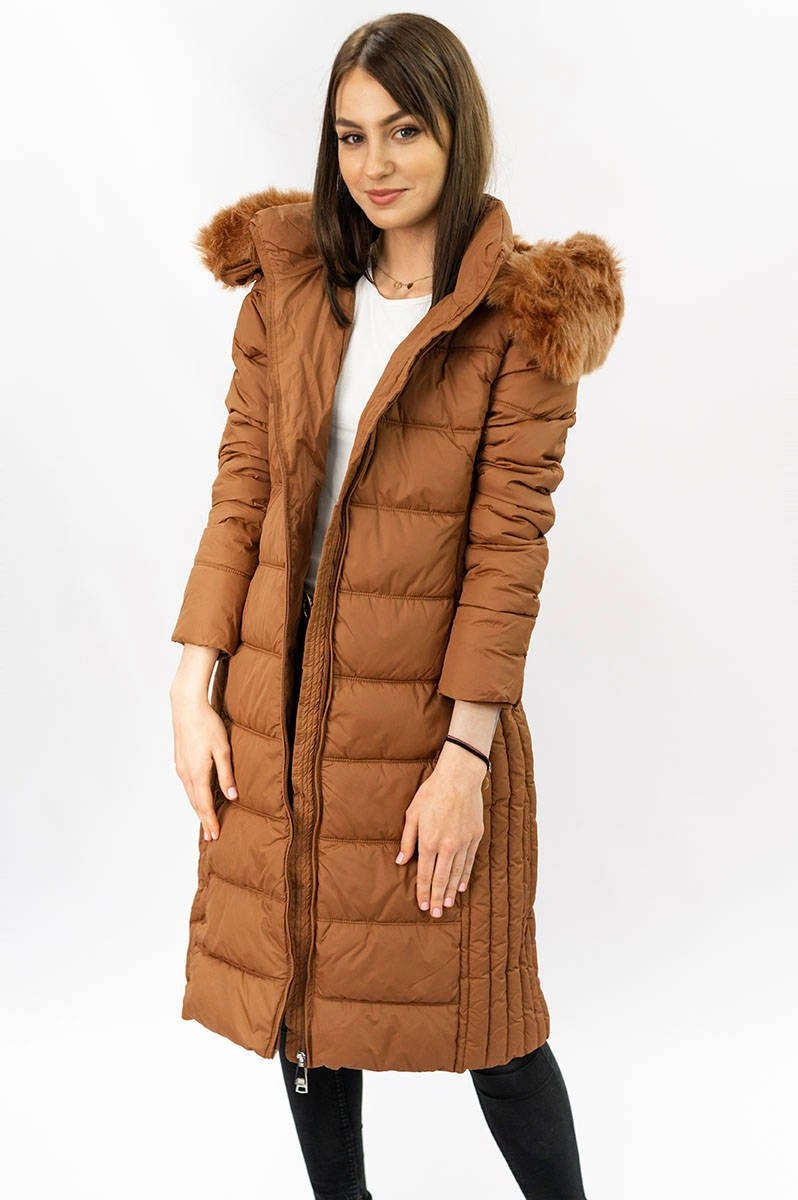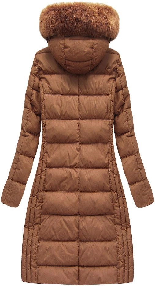 DŁUGA KURTKA DAMSKA ZIMOWA Z KAPTUREM KARMELOWA (7753)