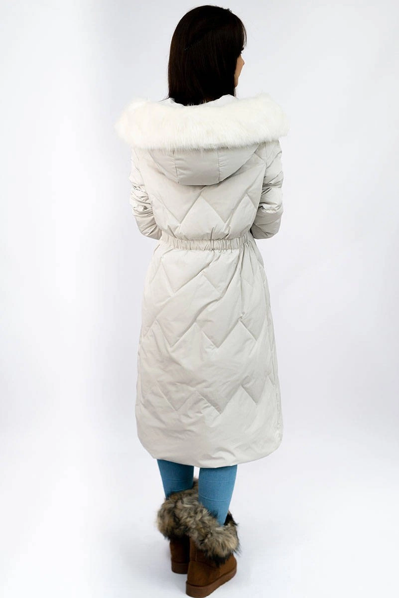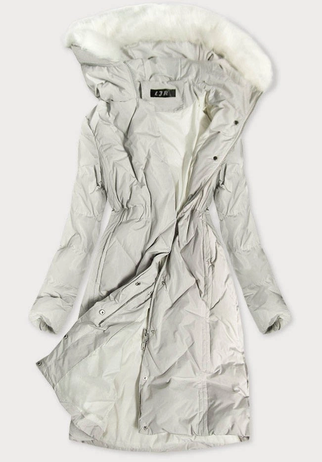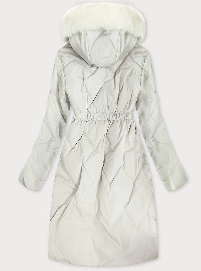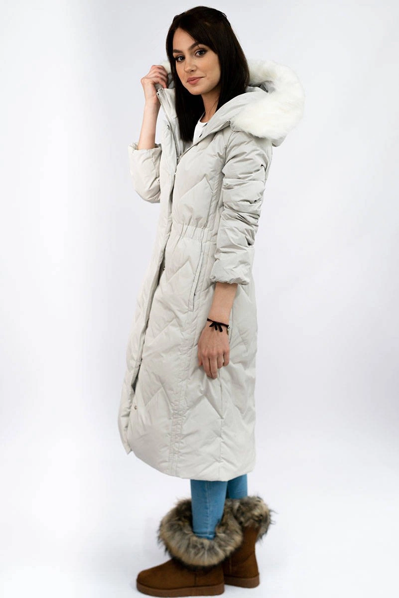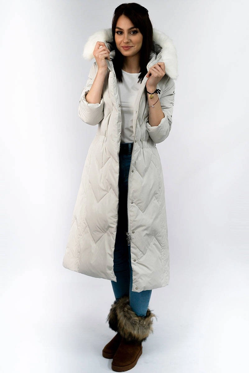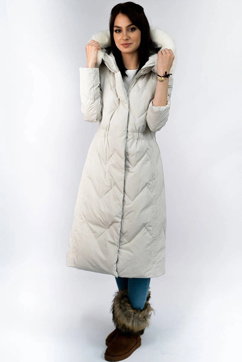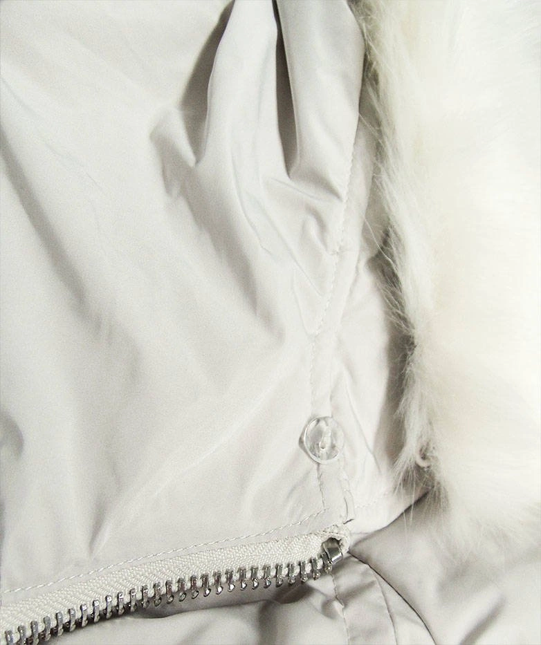 ZIMOWY PŁASZCZ DAMSKI Z KAPTUREM I PUCHEM NATURALNYM JASNOSZARY (7119)