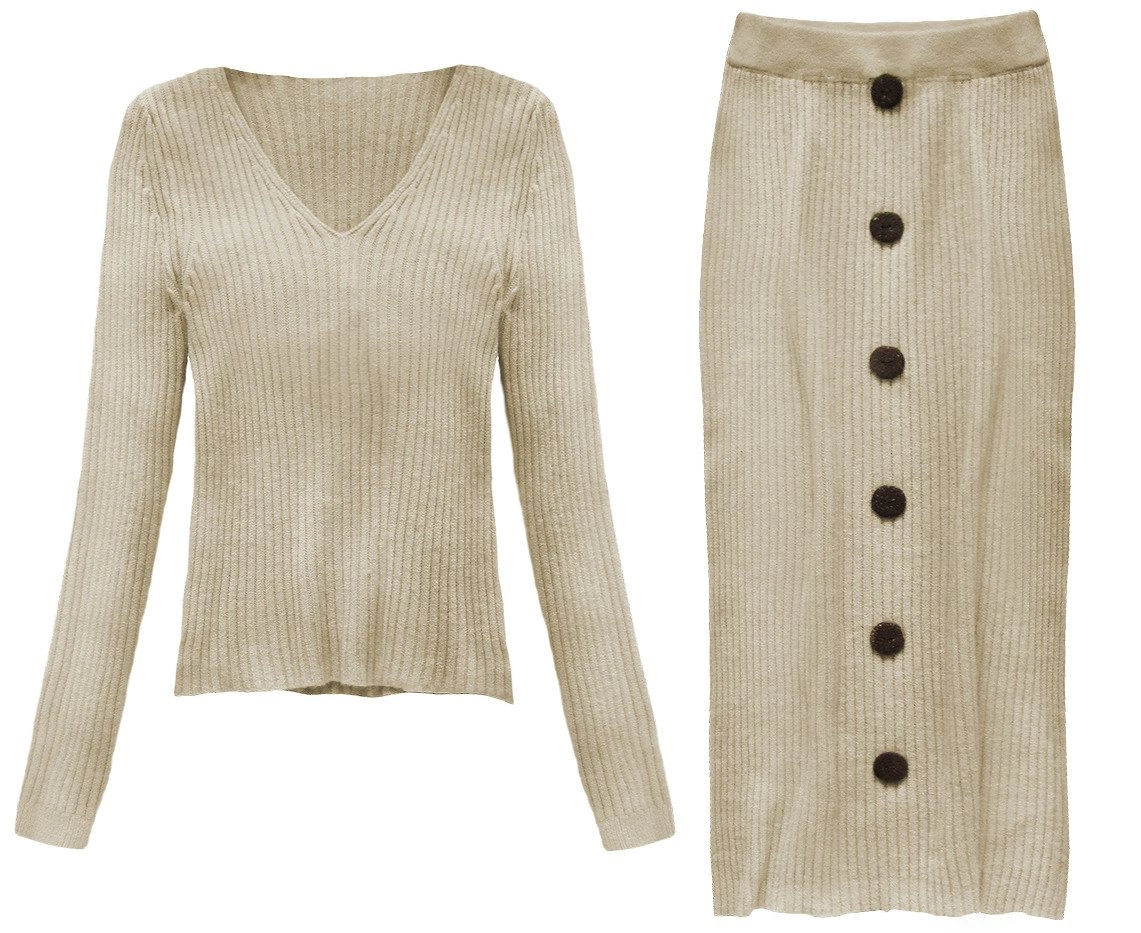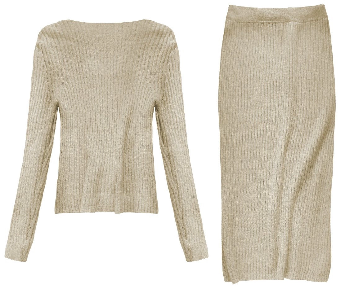KOMPLET A'LA WEŁNIANY SWETER+SPÓDNICA CIEMNOBEŻOWY (157ART)