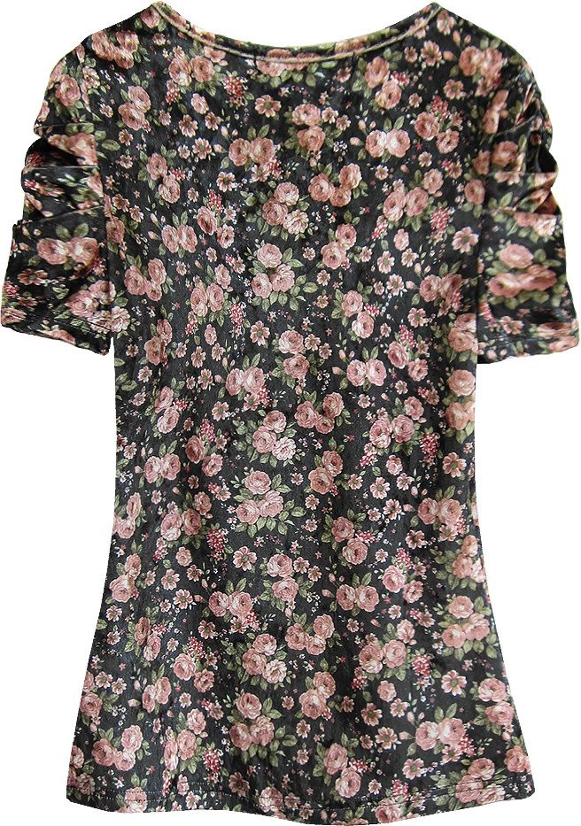 WELUROWA BLUZKA W KWIATY CZARNO-ŁOSOSIOWA (3682/3)