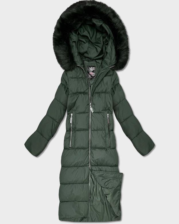 Długa damska kurtka zimowa z kapturem butelkowa zieleń (7688)