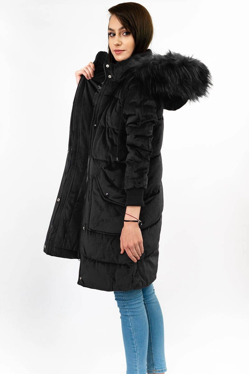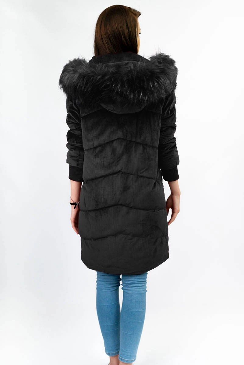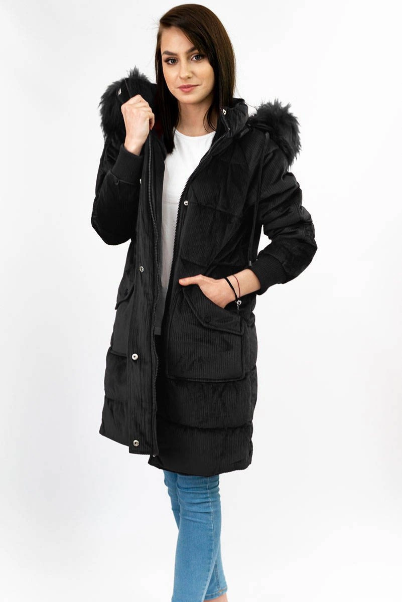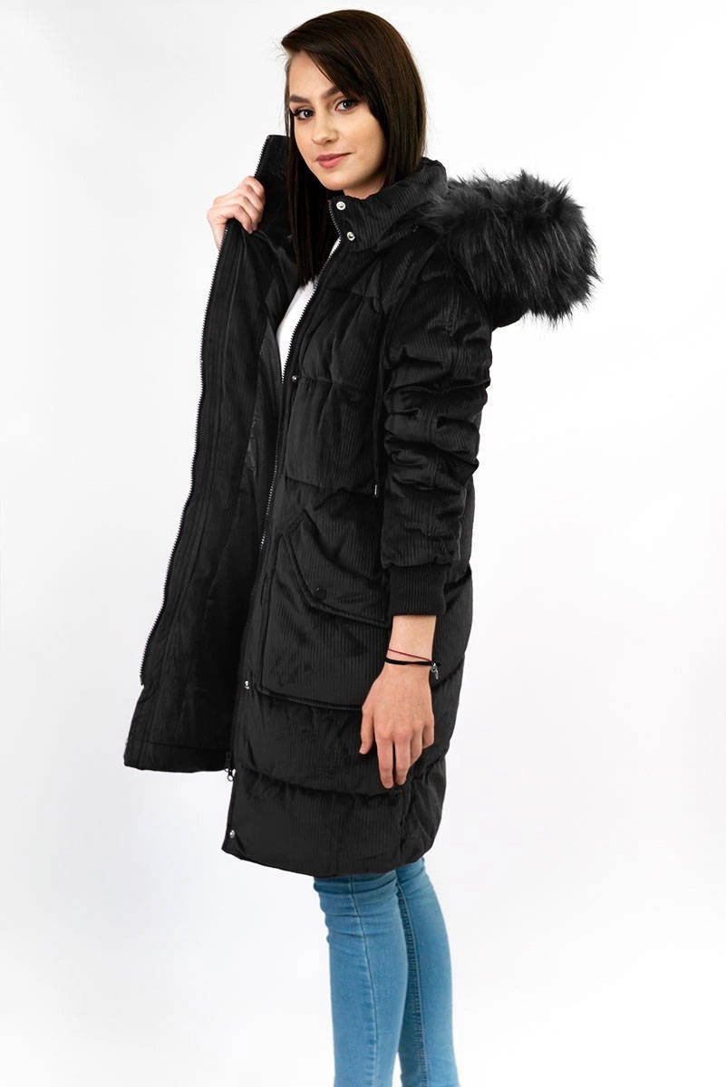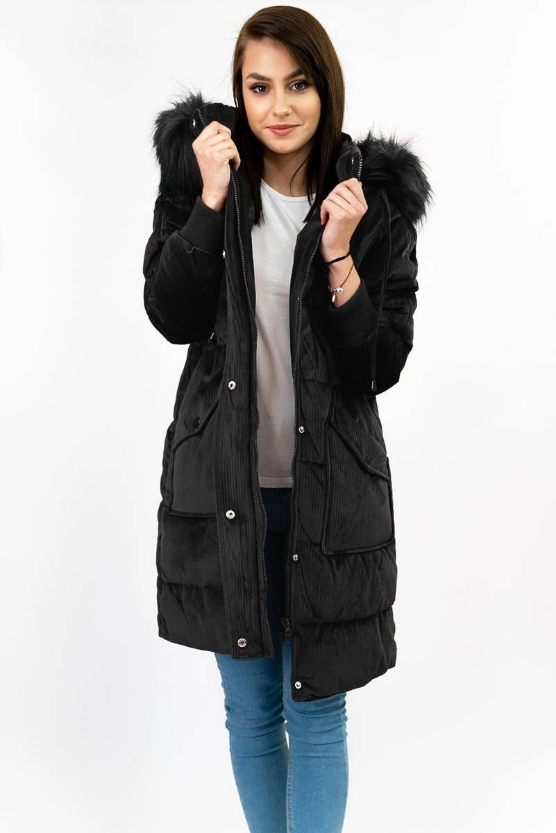 Opinie o Sztruksowa zimowa kurtka damska z kapturem czarna (7764)