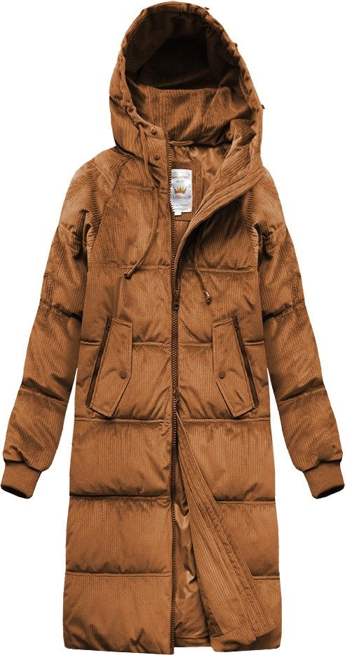 Zimowa sztruksowa kurtka damska z kapturem karmelowa (7763)