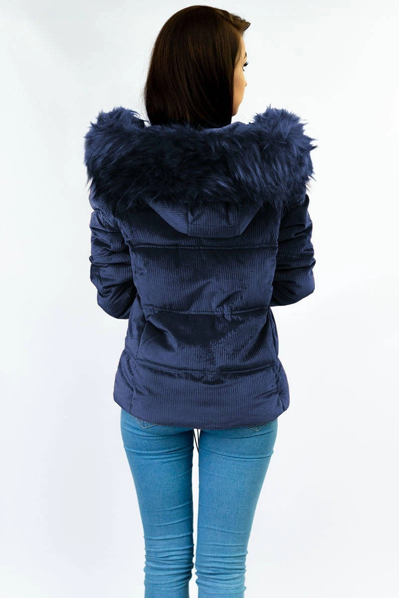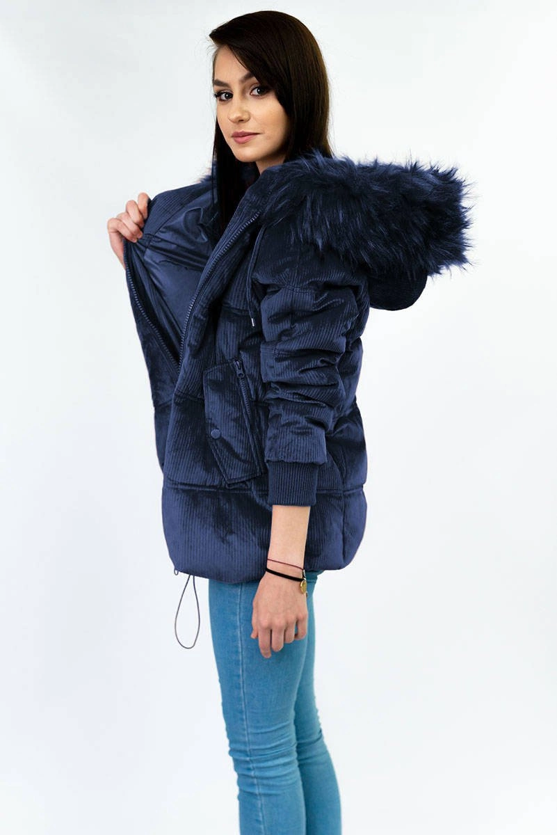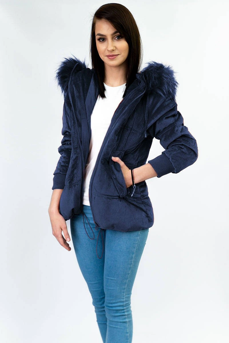 Sztruksowa damska kurtka z kapturem granatowa (7696)