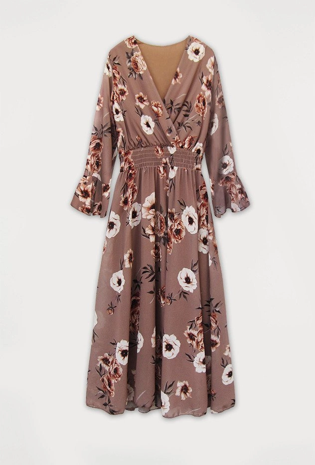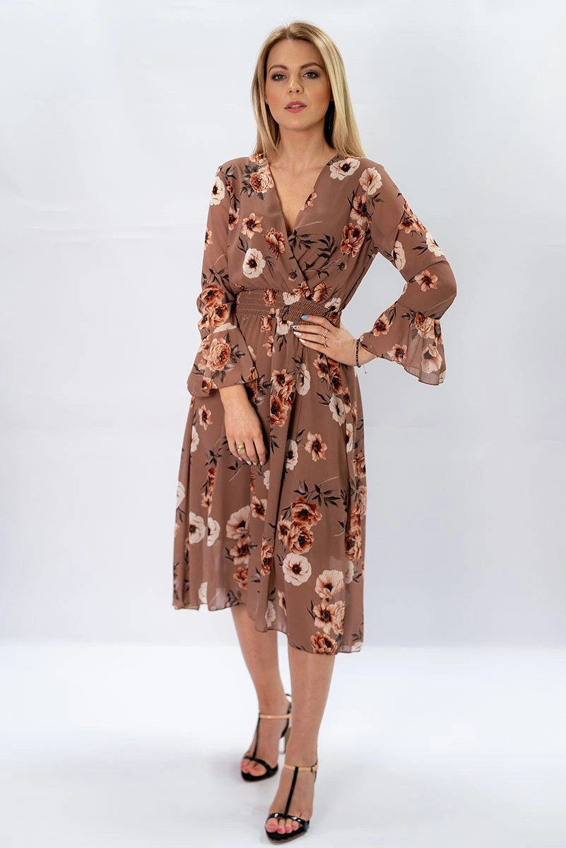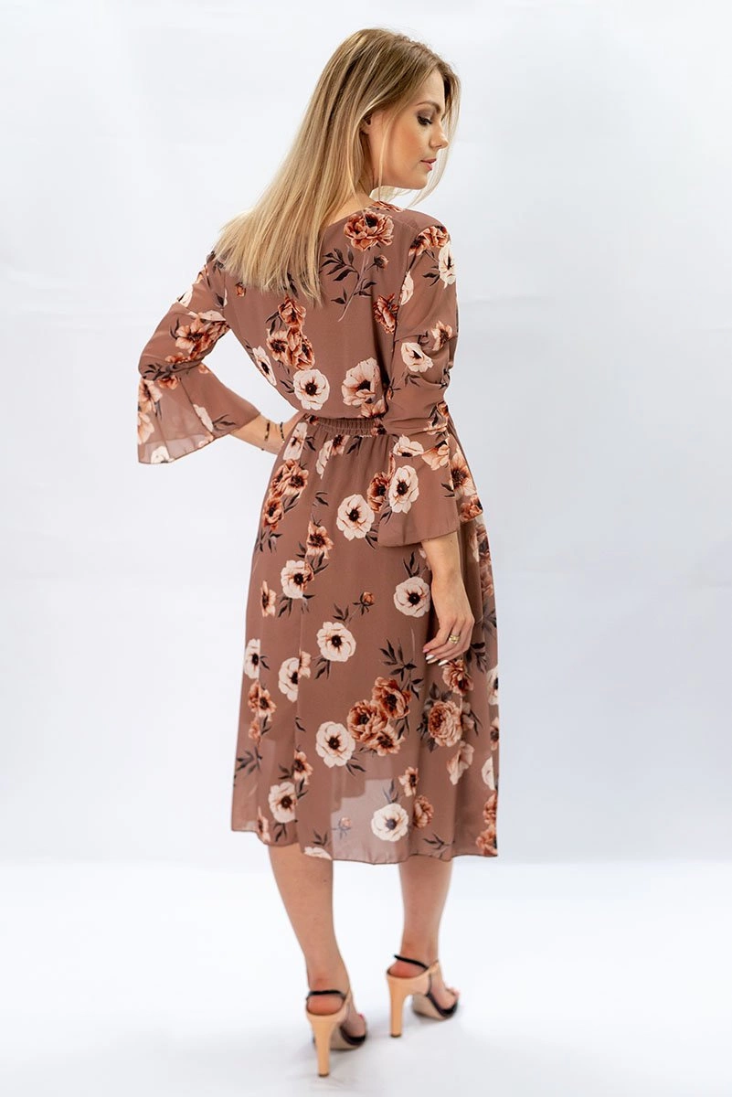 SZYFONOWA SUKIENKA KOPERTOWA W KWIATY BRĄZOWA (483ART)