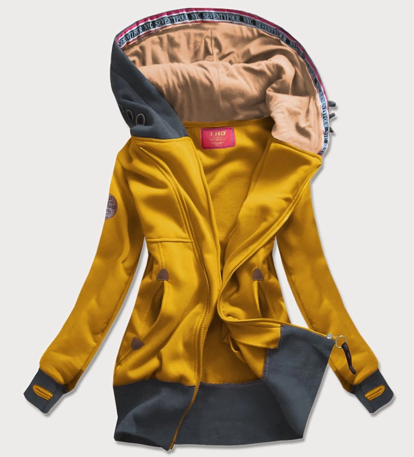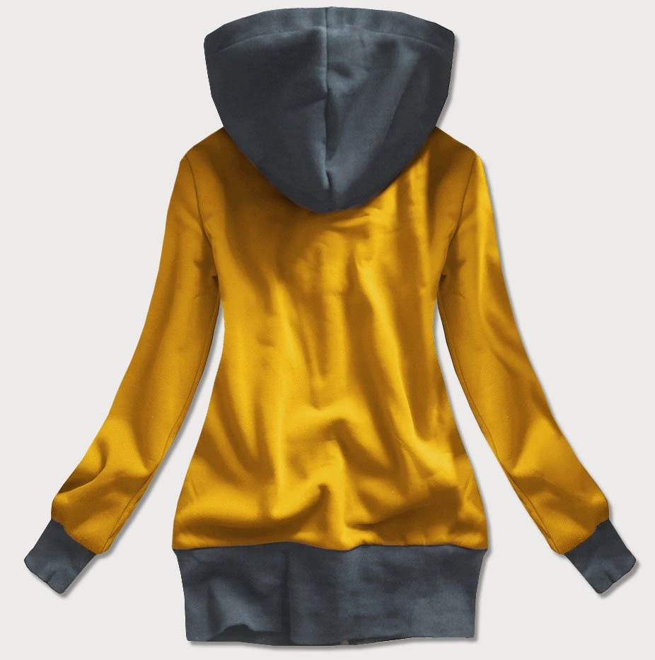 DŁUGA BLUZA DAMSKA Z ASYMETRYCZNYM ZAMKIEM MUSZTARDOWA (560)