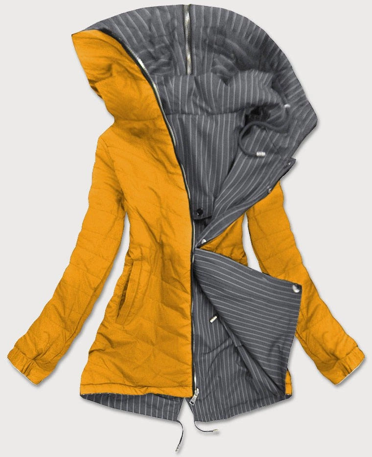 DWUSTRONNA KURTKA Z KAPTUREM W PASKI SZARO-ŻÓŁTA (W659)