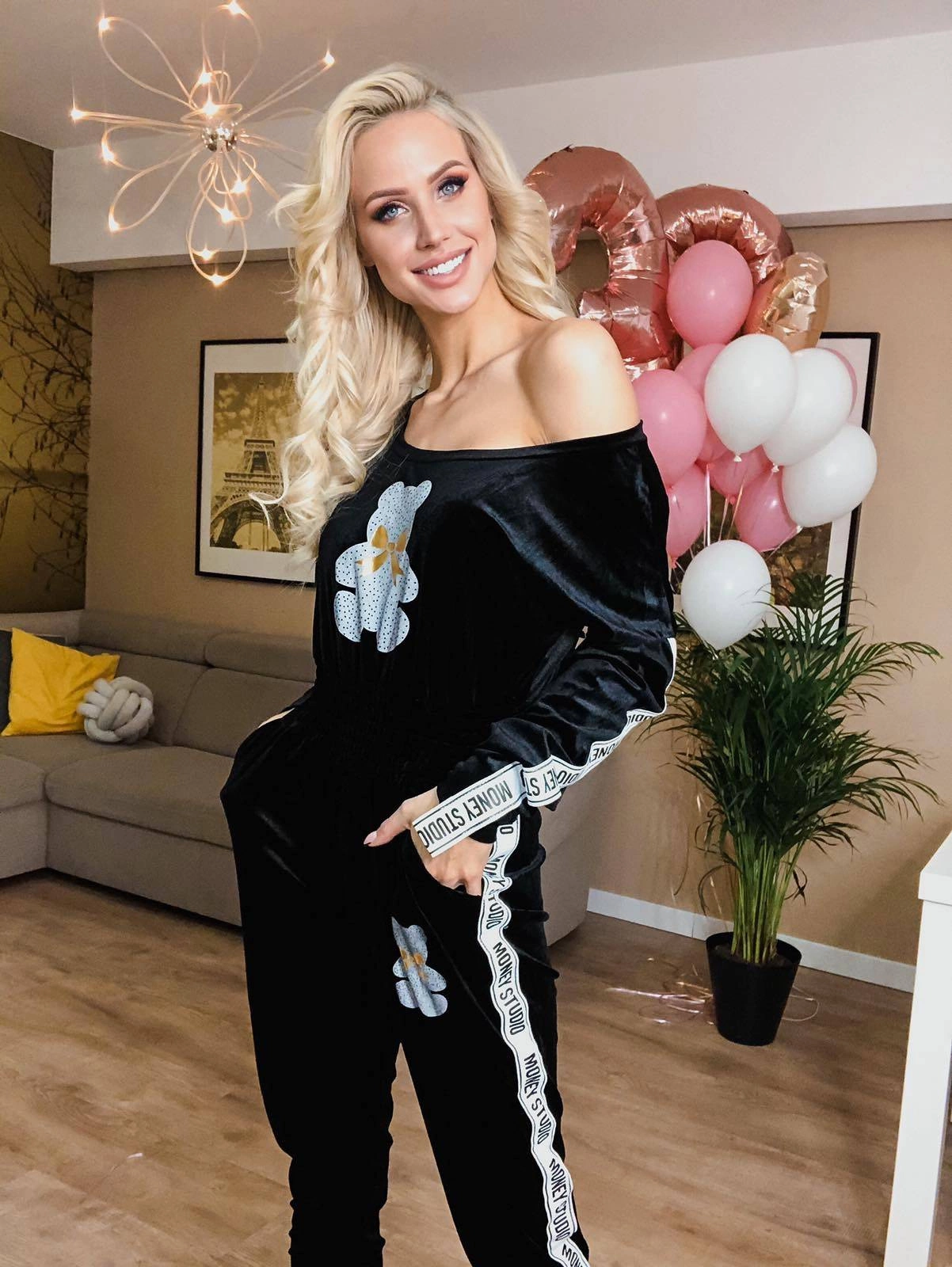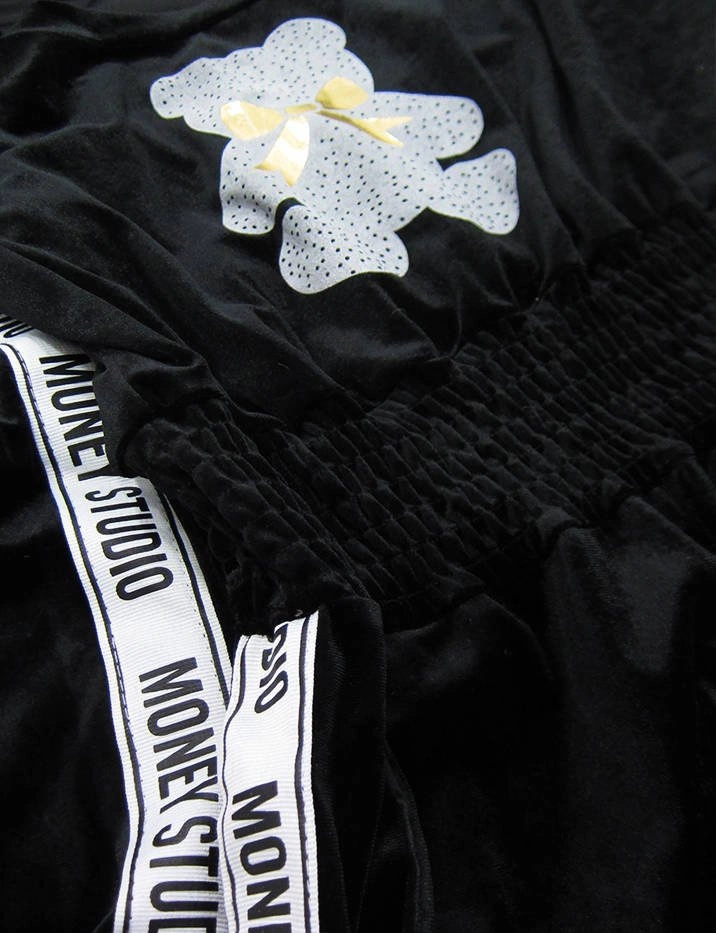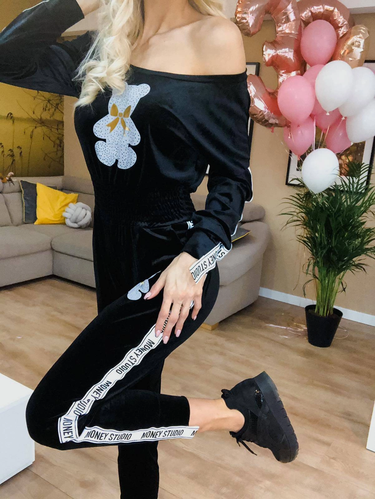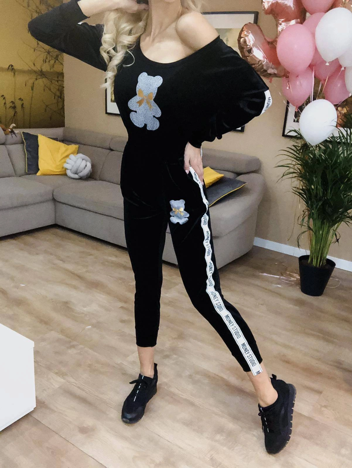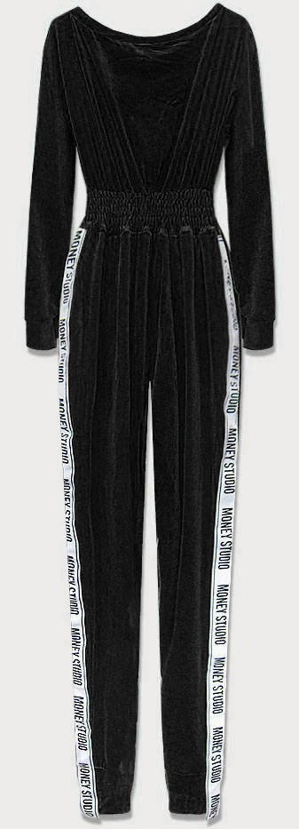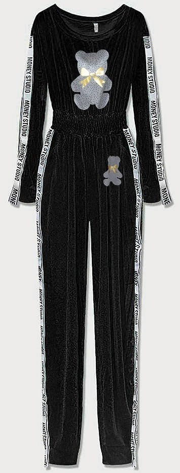DŁUGI KOMBINEZON WELUROWY Z LAMPASAMI I NADRUKIEM CZARNY (647ART)