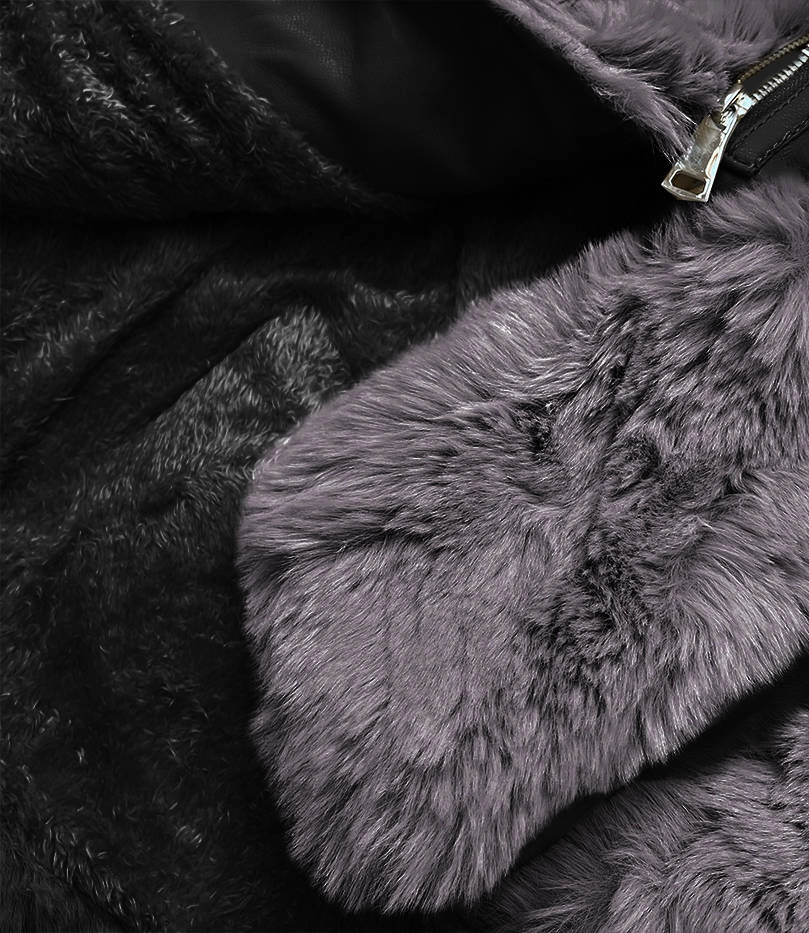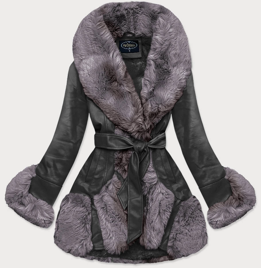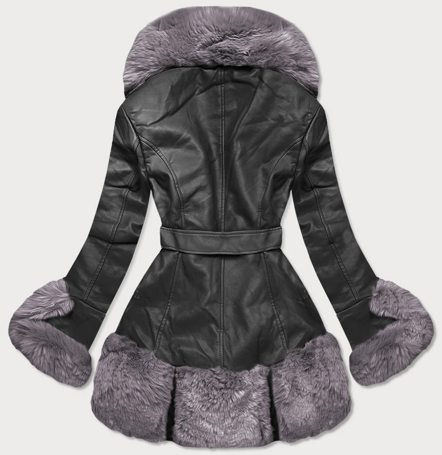 ELEGANCKA KURTKA SKÓRZANA Z FUTRZANYM KOŁNIERZEM CZARNO-SZARA (FL202018)