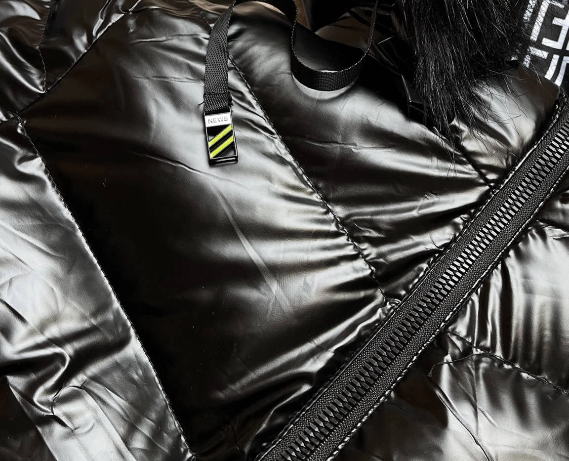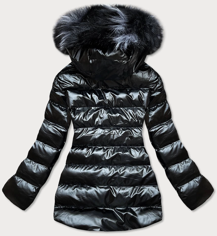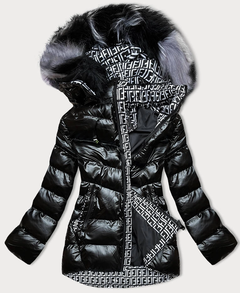 BŁYSZCZĄCA KURTKA ZIMOWA Z WZORZYSTYMI WSTAWKAMI CZARNA (XW809X)