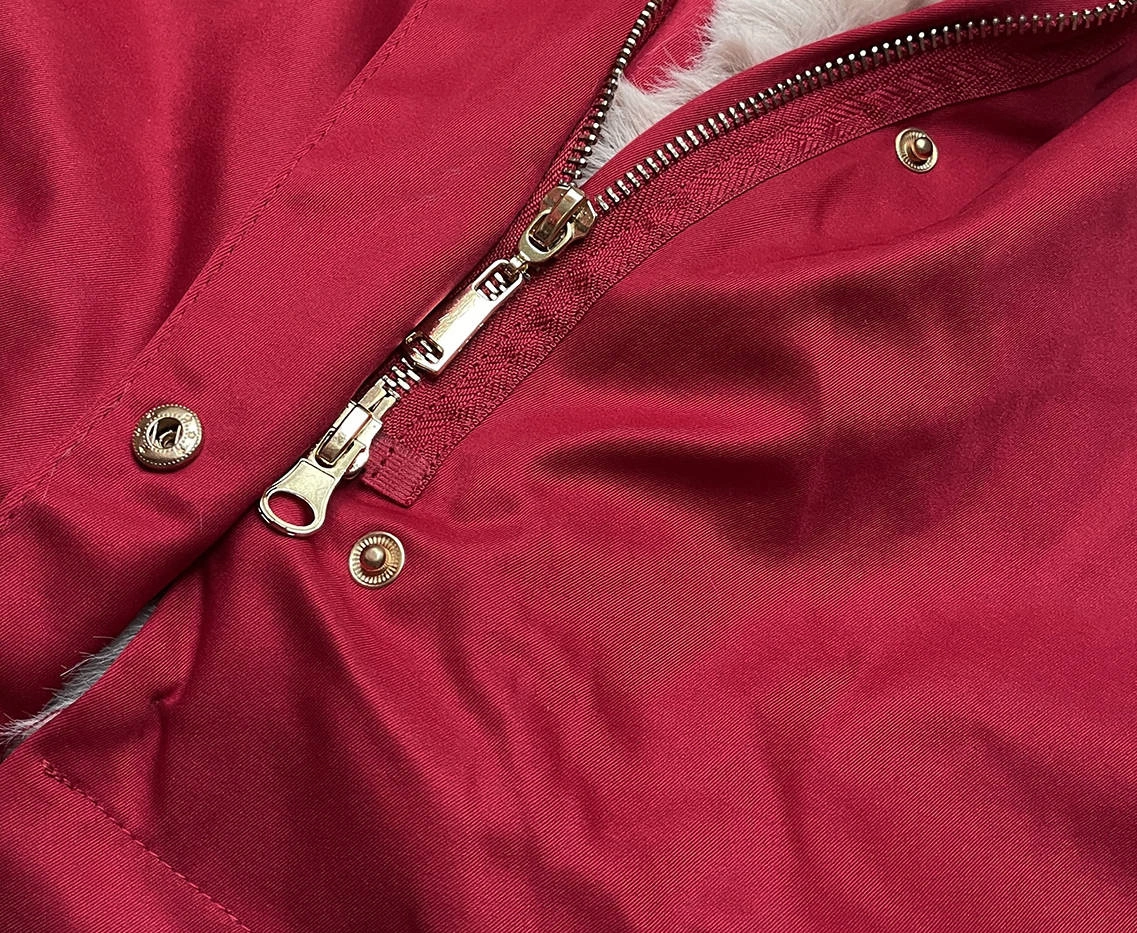 - Nieodpinany kaptur z odpinanym futrem wzdłuż zamka, kaptura i rękawów