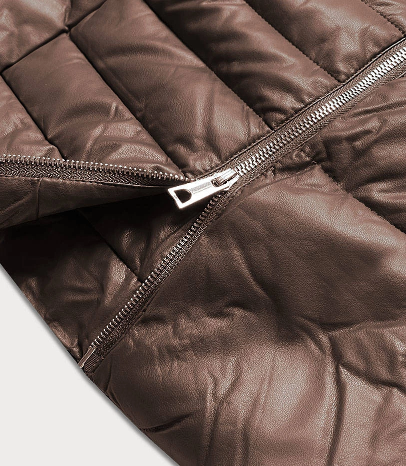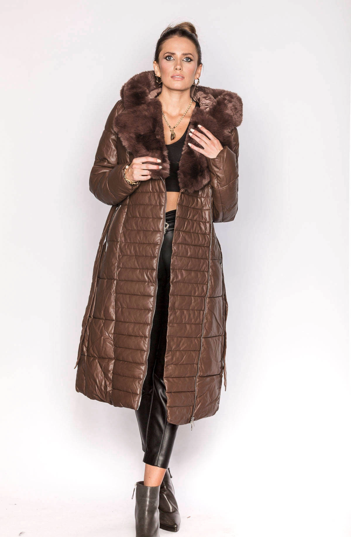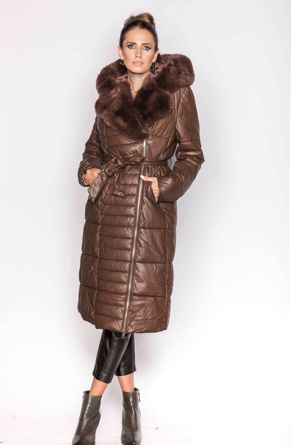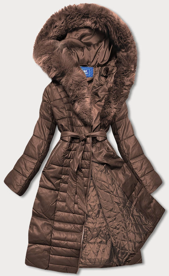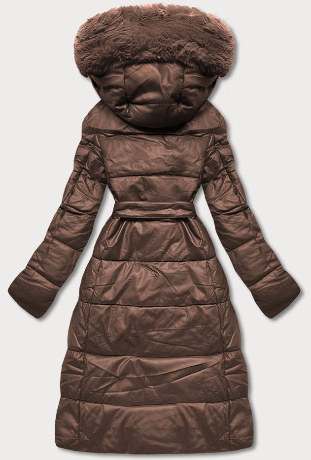 KURTKA DAMSKA Z FUTRZANYM KOŁNIERZEM BRĄZOWA (AG6-28)