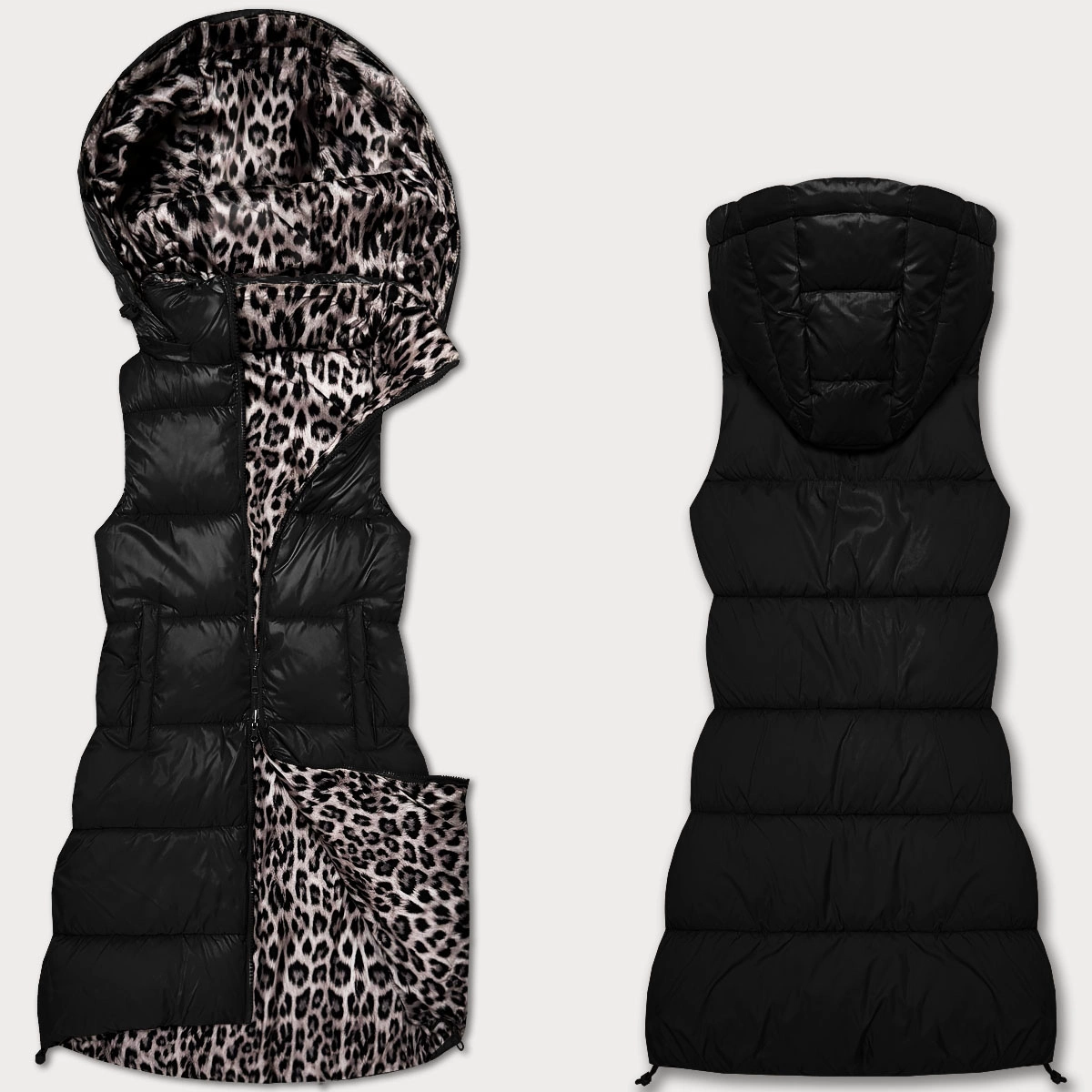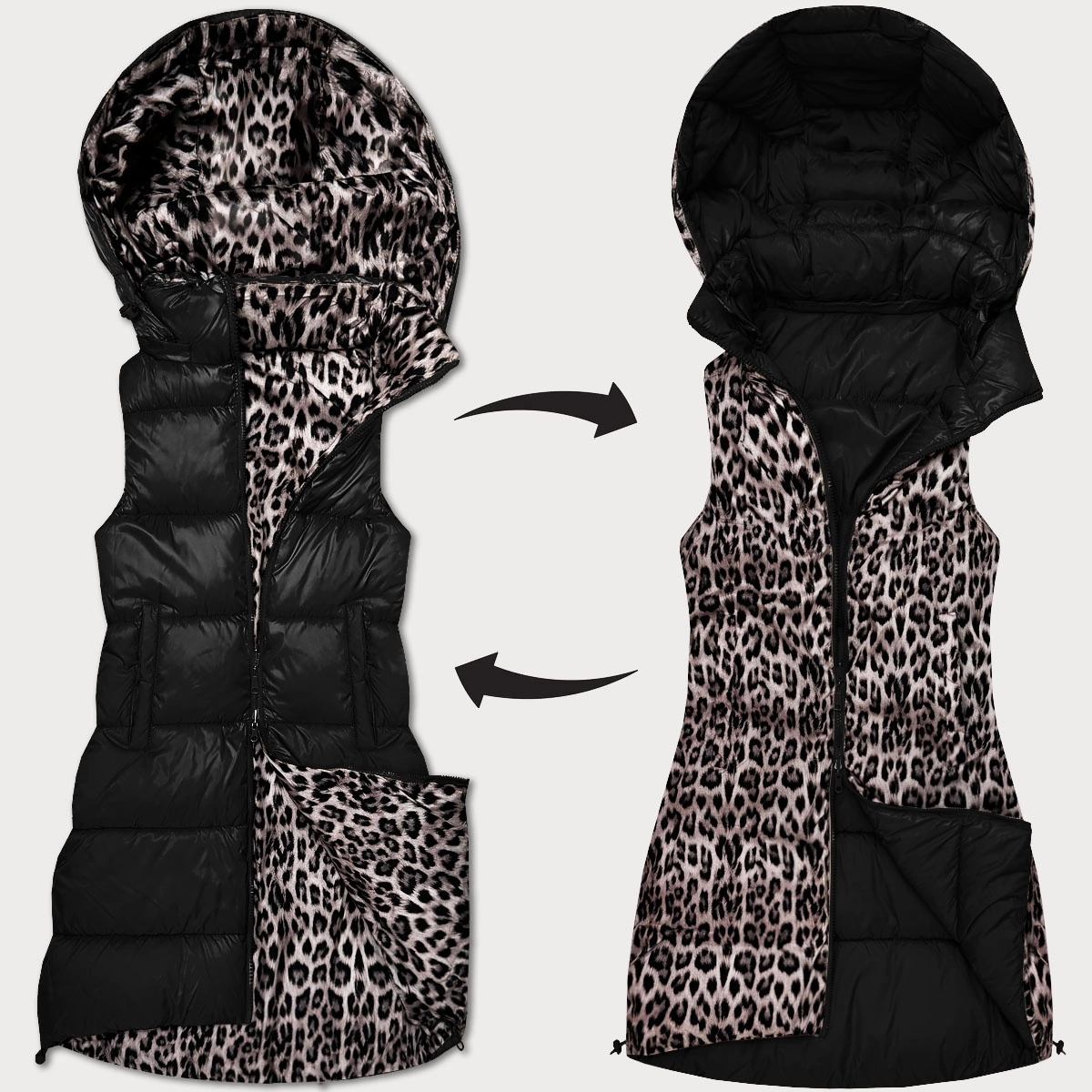Gruba kamizelka dwustronna z odpinanym kapturem czarny-panterka (T5-2602#-1)