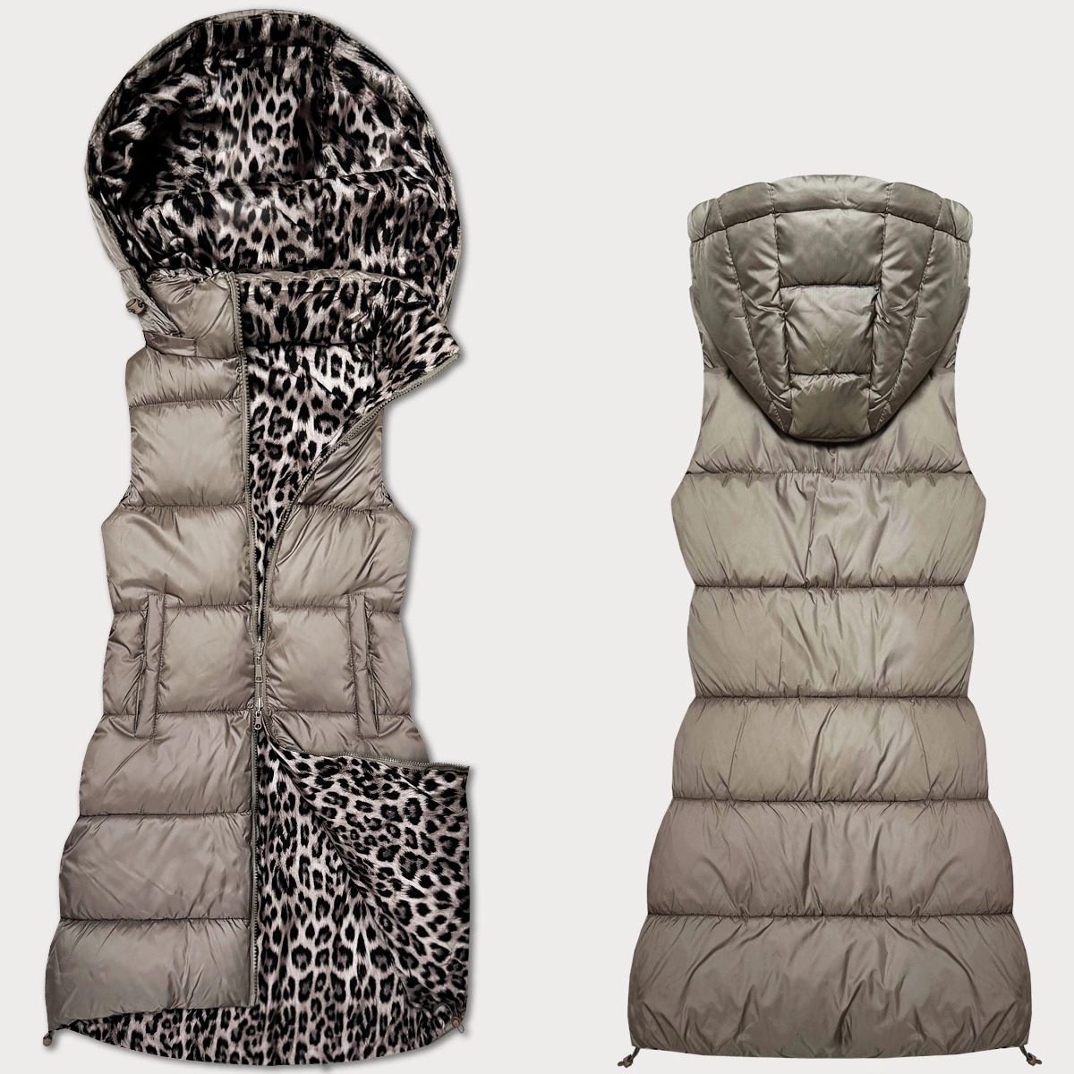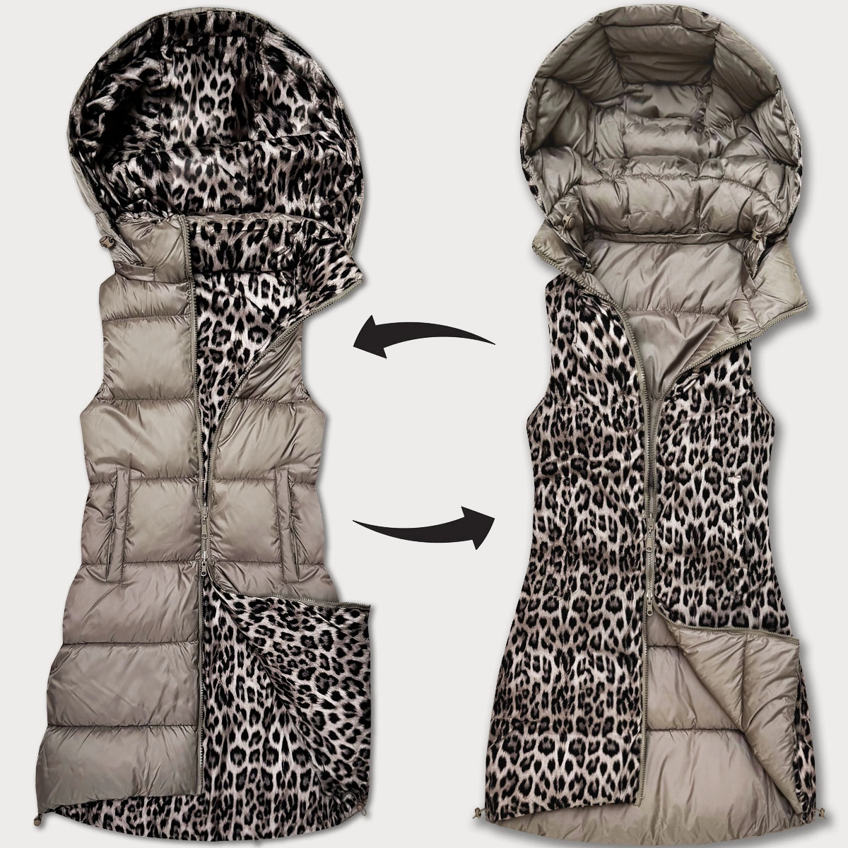 Gruba kamizelka dwustronna z odpinanym kapturem beżowy-panterka (T5-2602#-62)