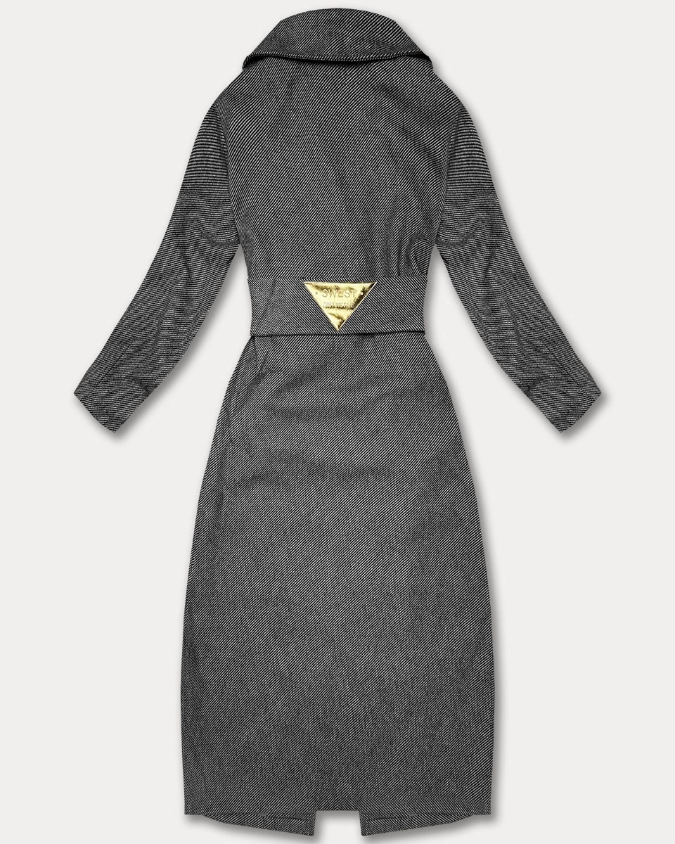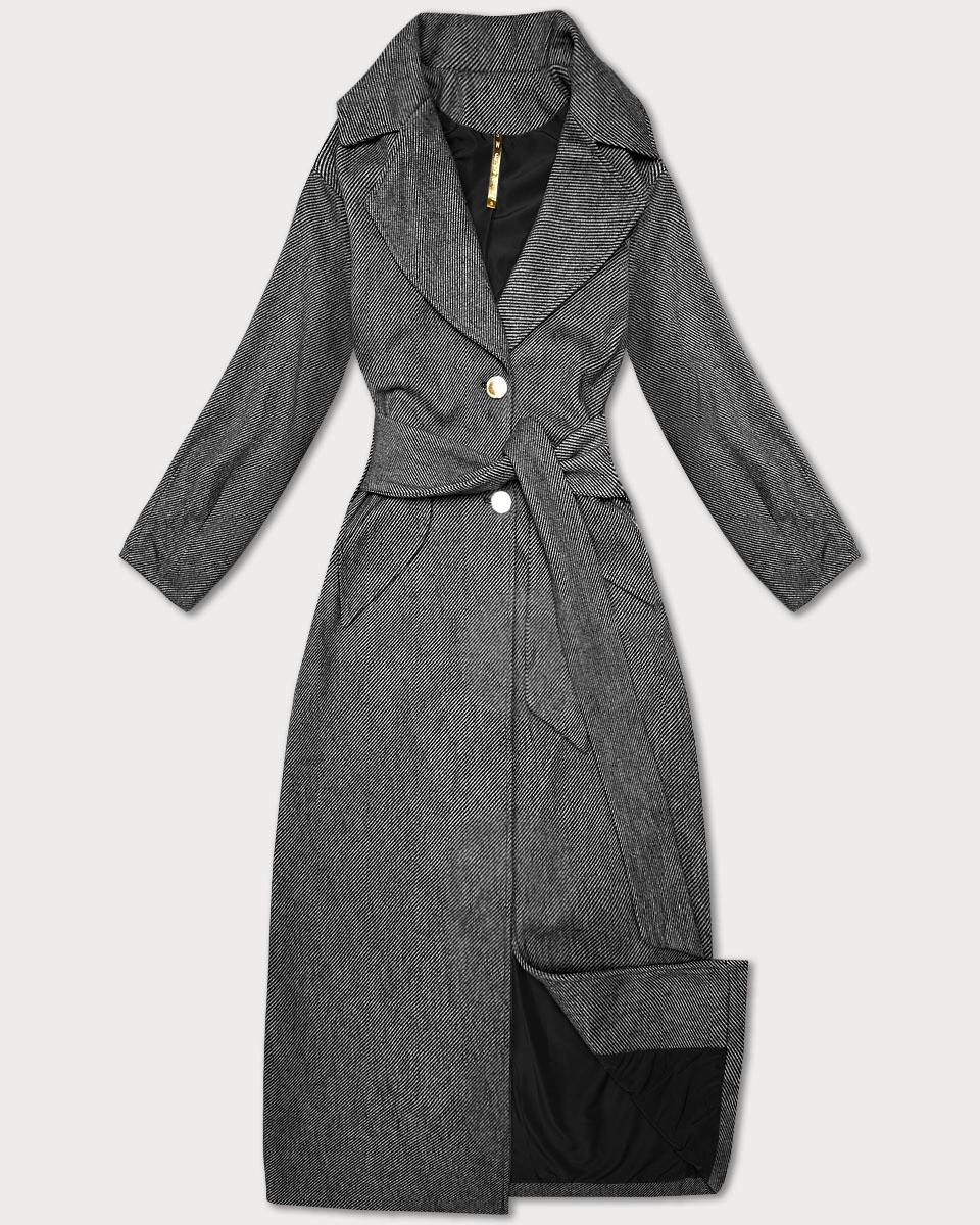 Długi płaszcz damski z paskiem S'West czarny-paseczki (B8542-1)