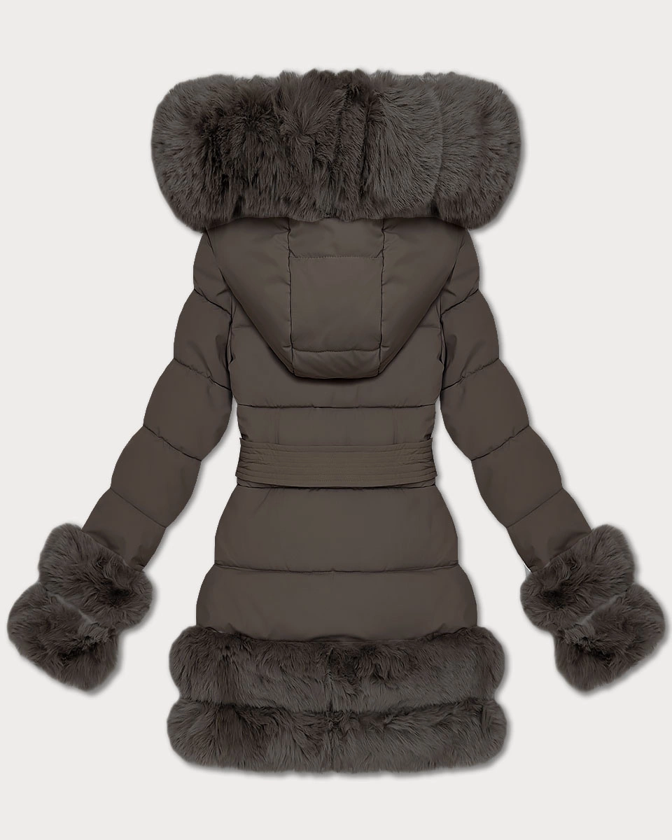 - Odpinany futrzany panel wokół kaptura i wzdłuż zamka