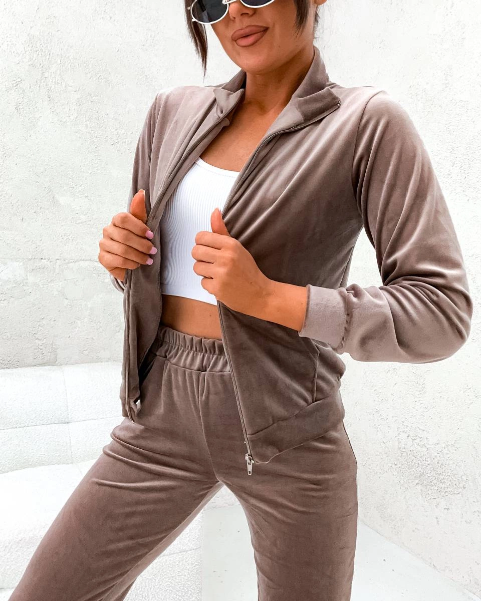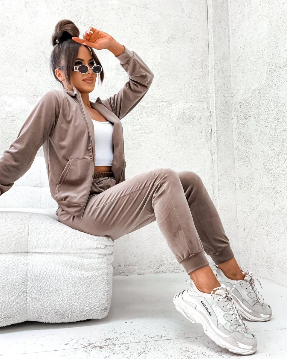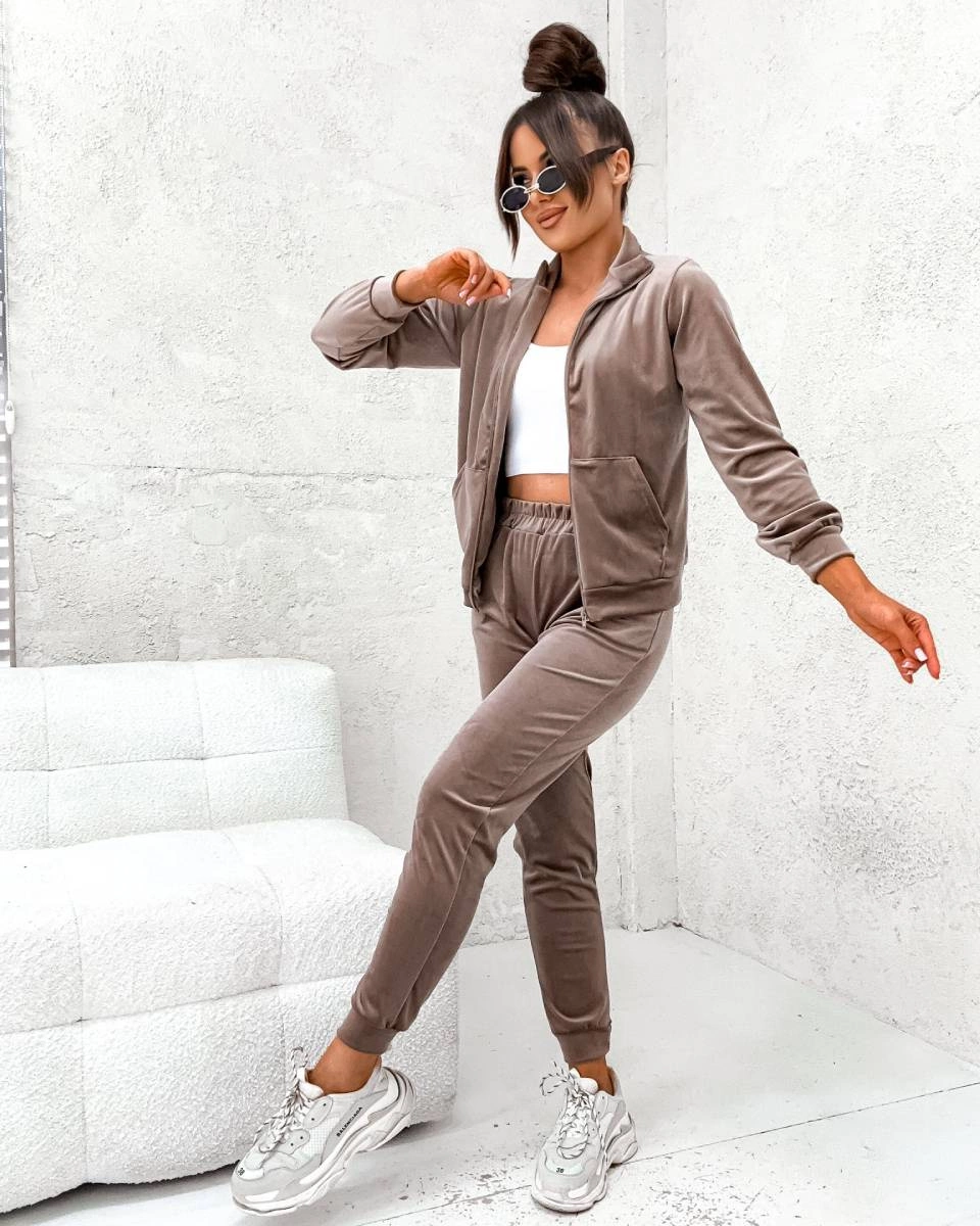 Welurowy komplet z rozpinaną bluzą cappuccino (771)