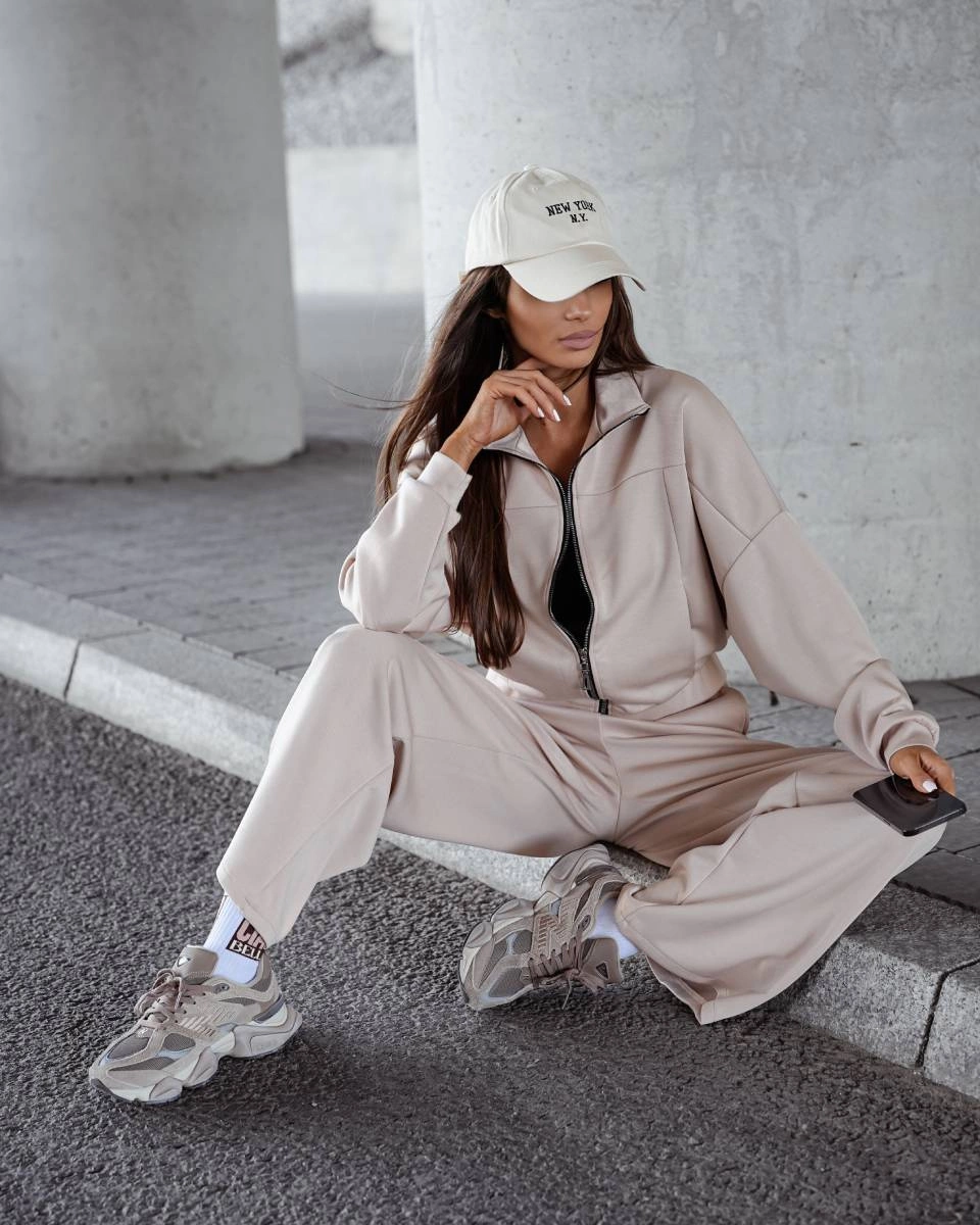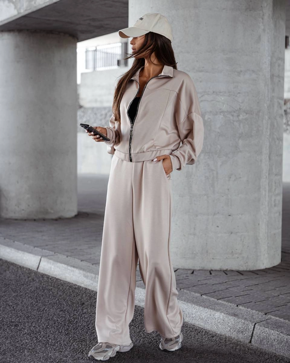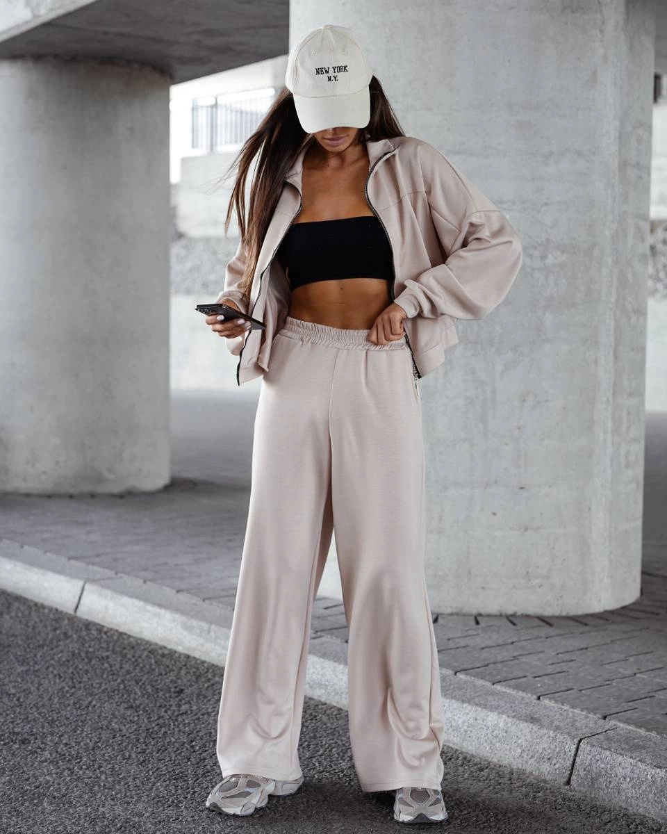 Komplet damski szerokie spodnie i bluza ze stójką beżowy (821109)