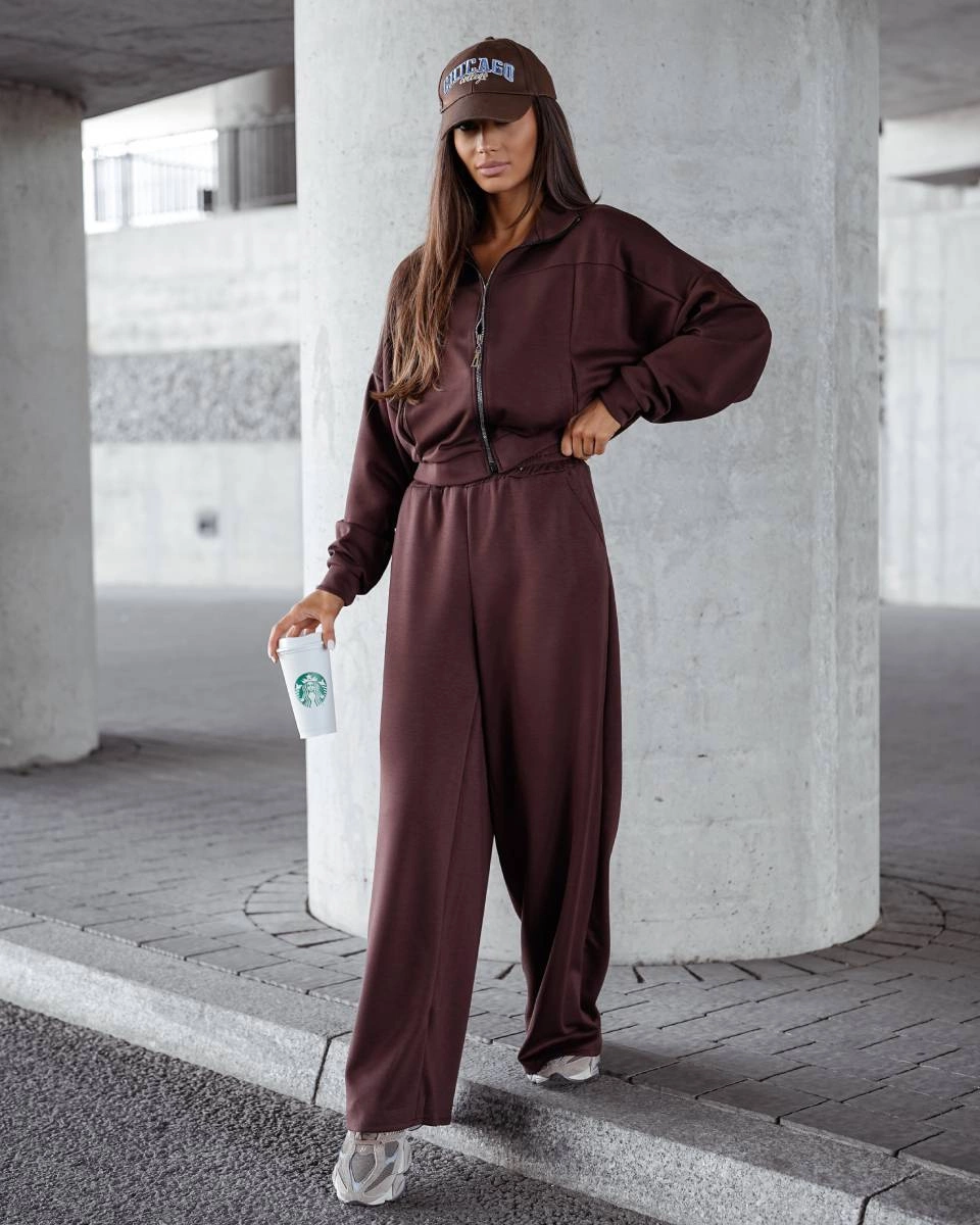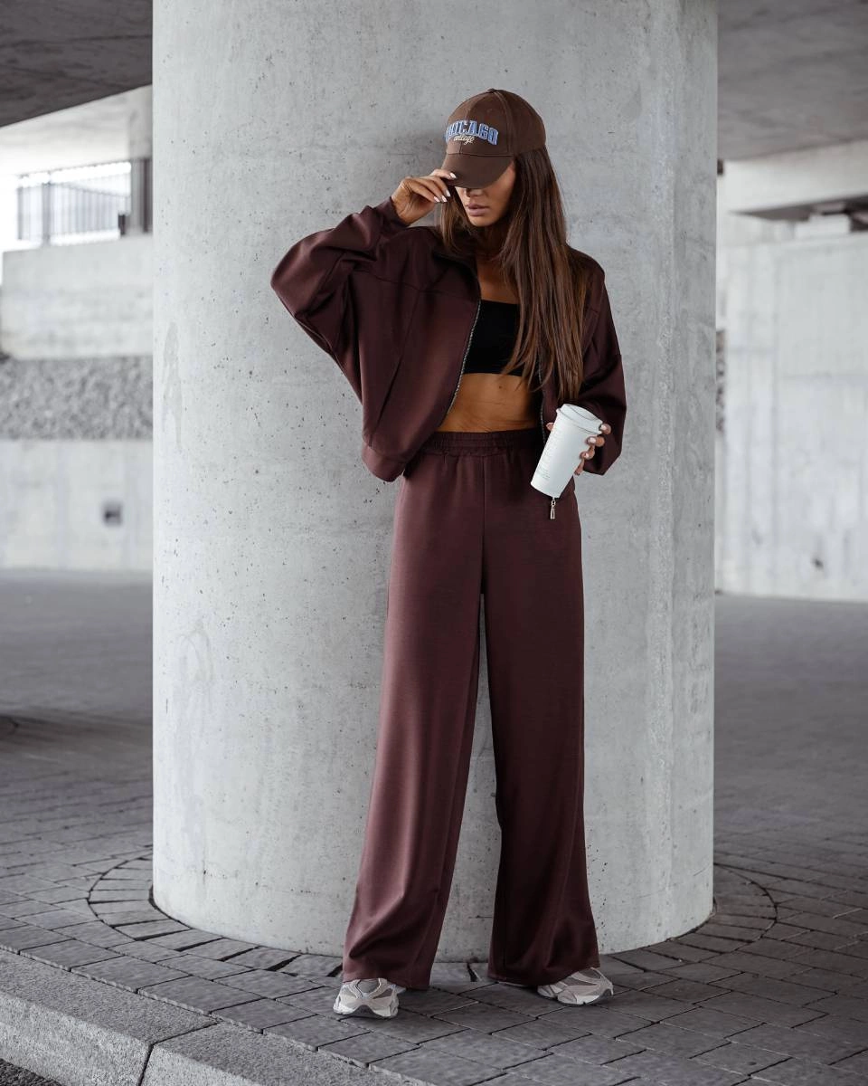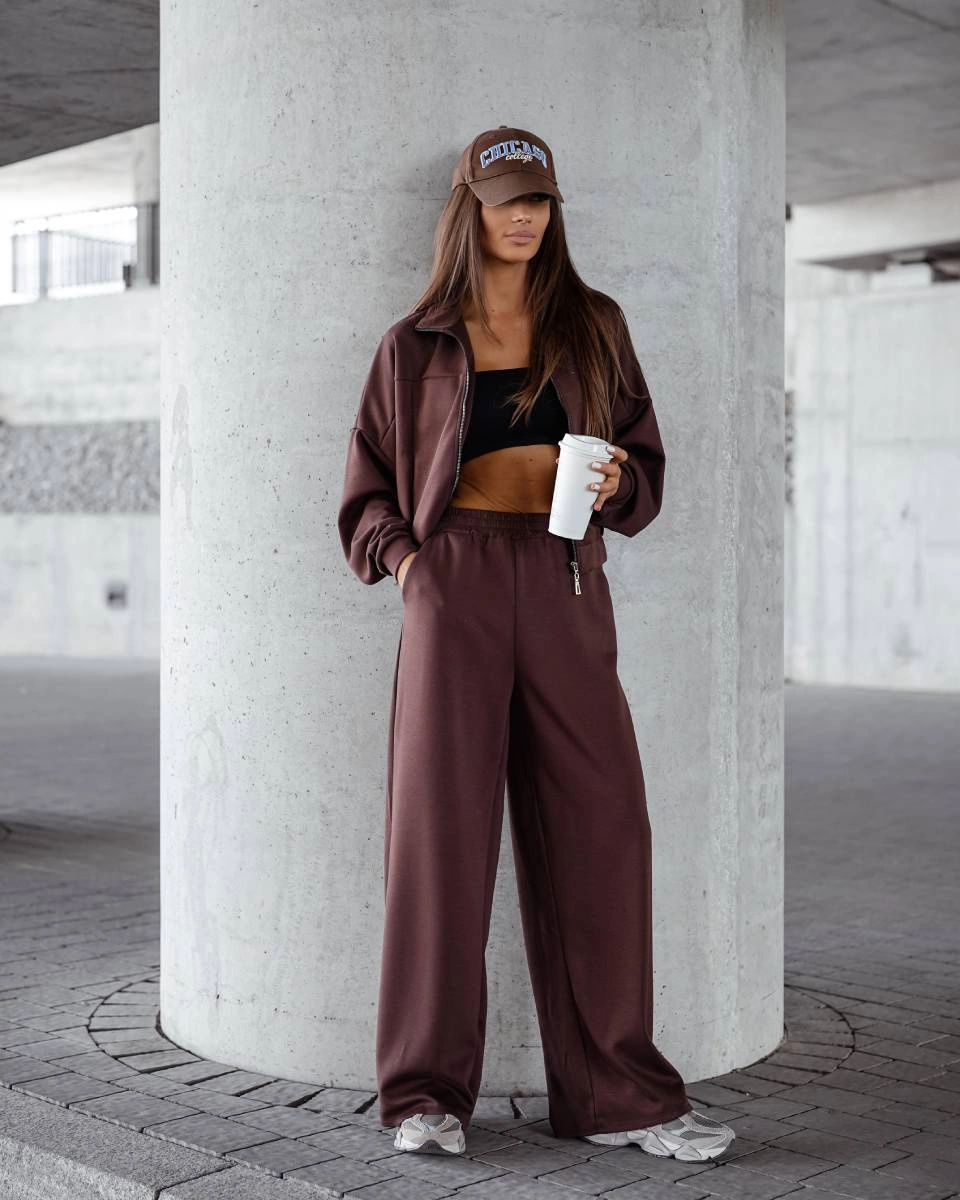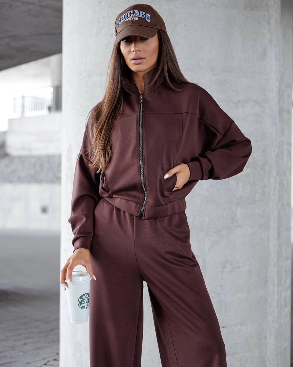 Komplet damski szerokie spodnie i bluza ze stójką czekoladowy (821109)