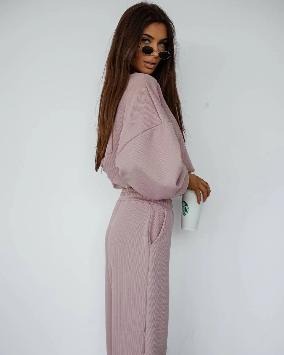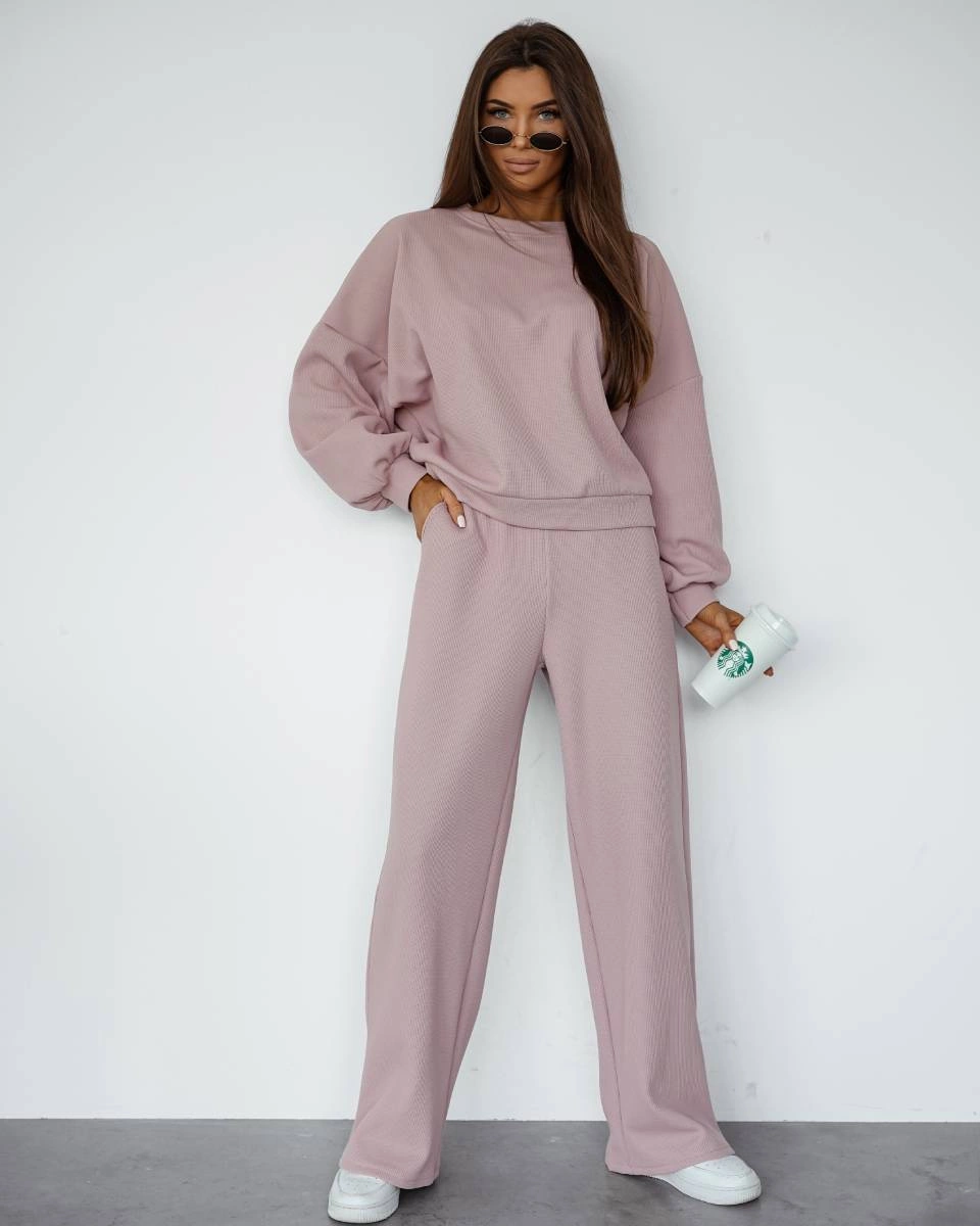Waflowy komplet damski bluza + spodnie pudrowy róż (821108)