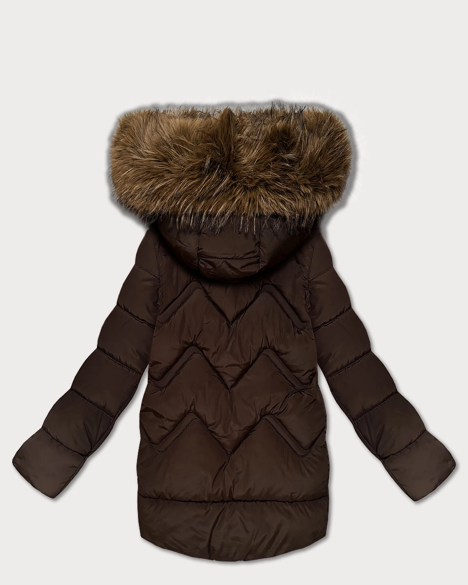 Puchowa zimowa kurtka damska z dużym kapturem brązowa (KK60589)
