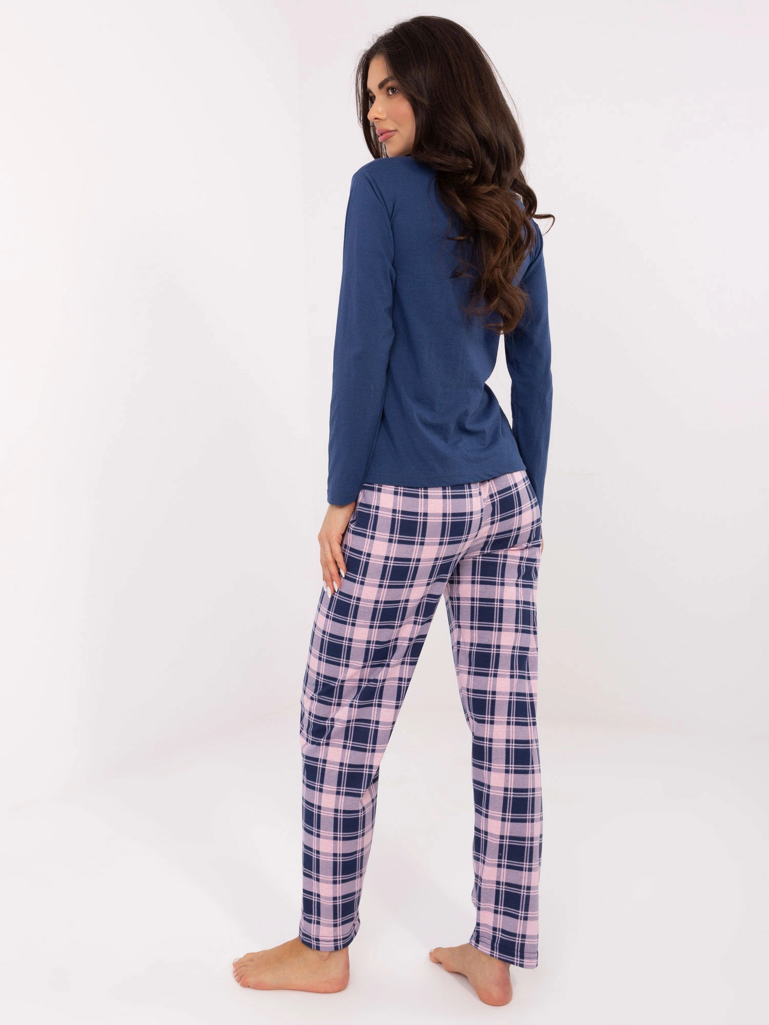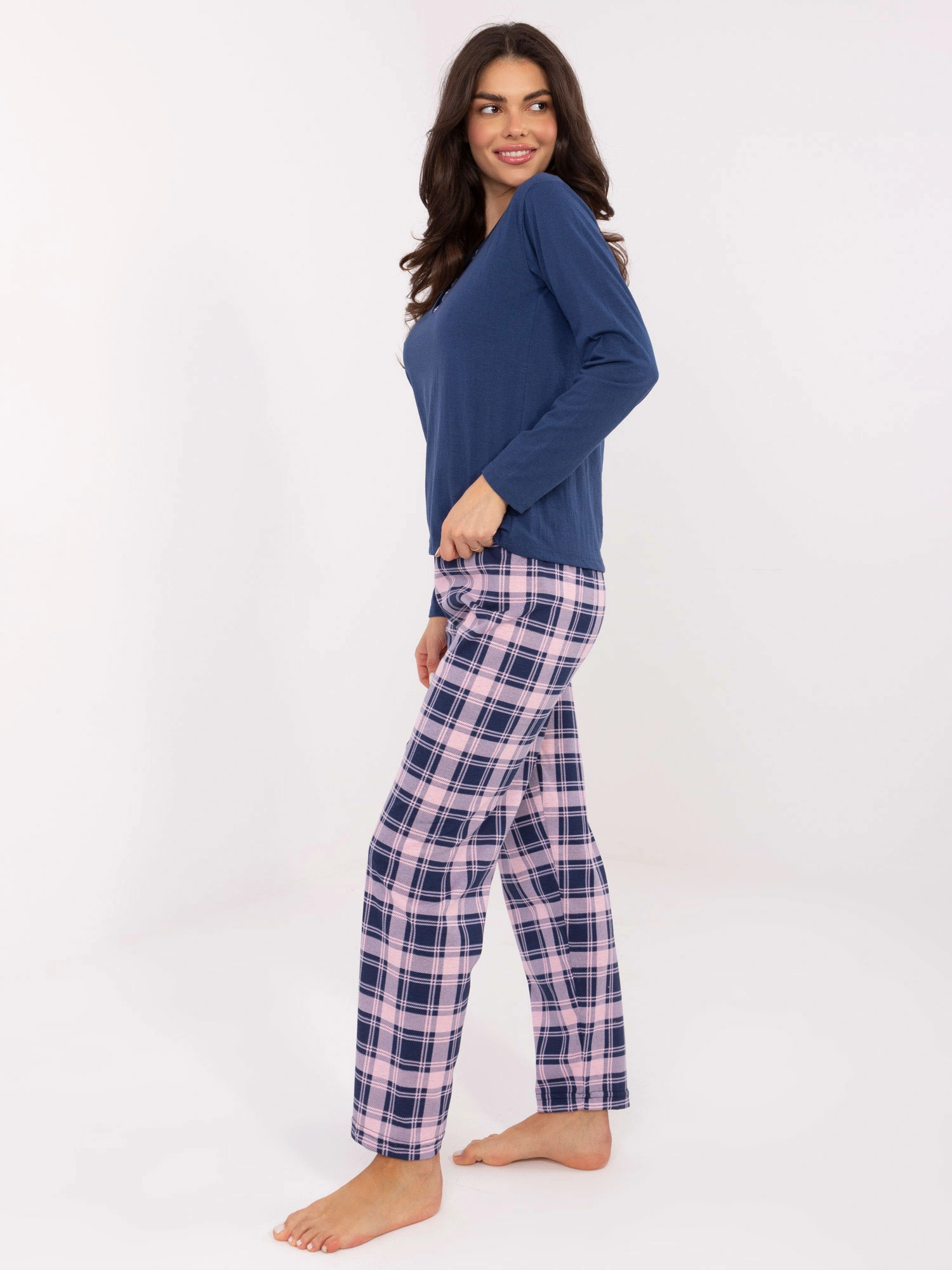 Bawełniana piżama damska ze spodniami w kratę Goodlookin granat/róż (004)