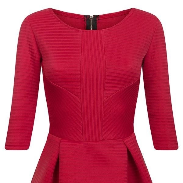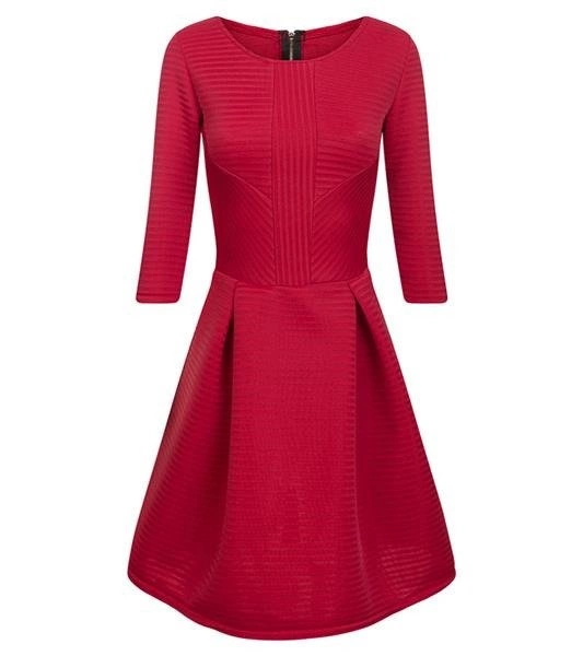 *Elegancka sukienka neoprenowa z zamkiem na plecach*. Sukienka jest bardzo szykowna. Materiał bardzo dobrej jakości - miękki, a zarazem usztywniony, piankowy. *Tłoczone paski* dodające sukience uroku. Świetny krój. *Taliowana* - pięknie dopasowuje się do sylwetki. Na dole *rozkloszowana*. Materiał sukienki lekko się naciąga. Zapinana na złoty zamek na plecach. Sukienka ma rękawy o długości 3/4. *Sukienka idealna do tworzenia oryginalnych stylizacji - nadaje nowoczesności i modnego wyglądu!* *Sukienka prezentuje się rewelacyjnie!*
