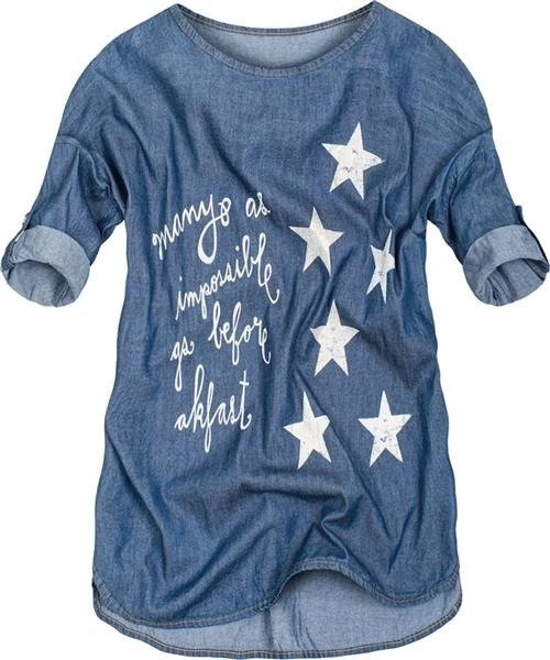 *Wyjątkowa tunika jeans'owa oversize z nadrukami*. Bardzo wygodna i uniwersalna. O bardzo luźnym kroju - *oversize*. Wykonana z bawełny bardzo dobrej jakości. Przyjemna w dotyku. Posiada świetne *delikatnie błyszczące nadruki*. *Rękawy można modnie podwinąć* i podpiąć guziczkiem. *Idealna do tworzenia oryginalnych stylizacji - nadaje nowoczesności i modnego wyglądu!* *Tunika prezentuje się rewelacyjnie!*