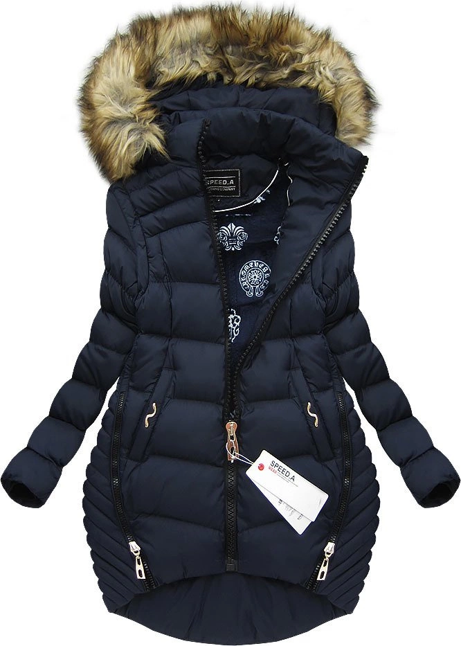 Bardzo ciepła długa kurtka zimowa z kapturem. Kurtka ocieplona puchem syntetycznym doskonałej jakości. Wnętrze dodatkowo ocieplone bardzo miłym w dotyku misiem, w finezyjny wzór. Kurtka posiada odpinany kaptur (na zamek) z futerkiem. Futerko przy kapturze jest odpinane (na guziczki) i układa się na panelu/zakładce wokół kaptura. W kapturze znajdują się także troki ściągające z stoperami. Ma także stójkę. Kurtka zapinana jest na zamek. Posiada 2 kieszenie zapinane na zamek. Kieszenie ozdobione są metalową aplikacją. Na bokach kurtki znajdują się ozdobne zamki. Dół kurtki jest asymetryczny - przód krótszy, tył dłuższy. Kurtka jest pikowana. Schowane ściągacze na końcach rękawów chronią przed napływającym zimnem. Kurtka ma odpinane rękawy tworząc bezrękawnik. Wykonana z świetnej jakości materiału. Bardzo wygodna i praktyczna. Kurtka idealna do tworzenia oryginalnych stylizacji. Kurtka pięknie się prezentuje.