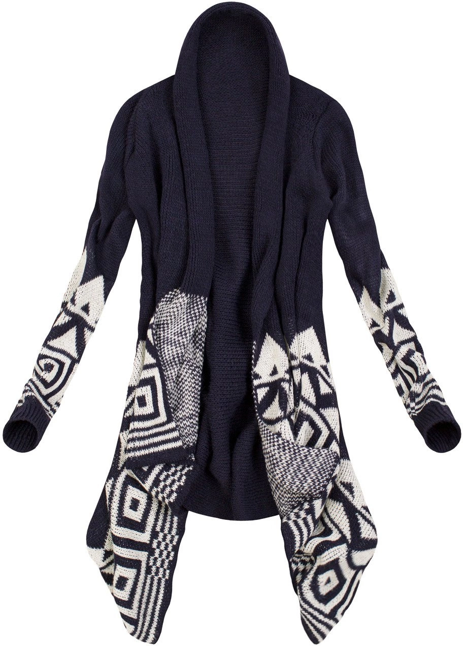 Unikalny kardigan w azteckie wzory. Bardzo modny fason i wzór. Pięknie układa się na ciele. Kardigan ma modnie wydłużone boki, co dodaje niepowtarzalności. Przód pięknie układa się w fale - waterfall. Narzutka jest bardzo wygodna. Wykonana z materiału bardzo dobrej jakości. Azteckie wzory dodają uroku i oryginalności. Ściągacze na końcach rękawów. Idealna do tworzenia wyjątkowych stylizacji. Kardigan rewelacyjnie się prezentuje.