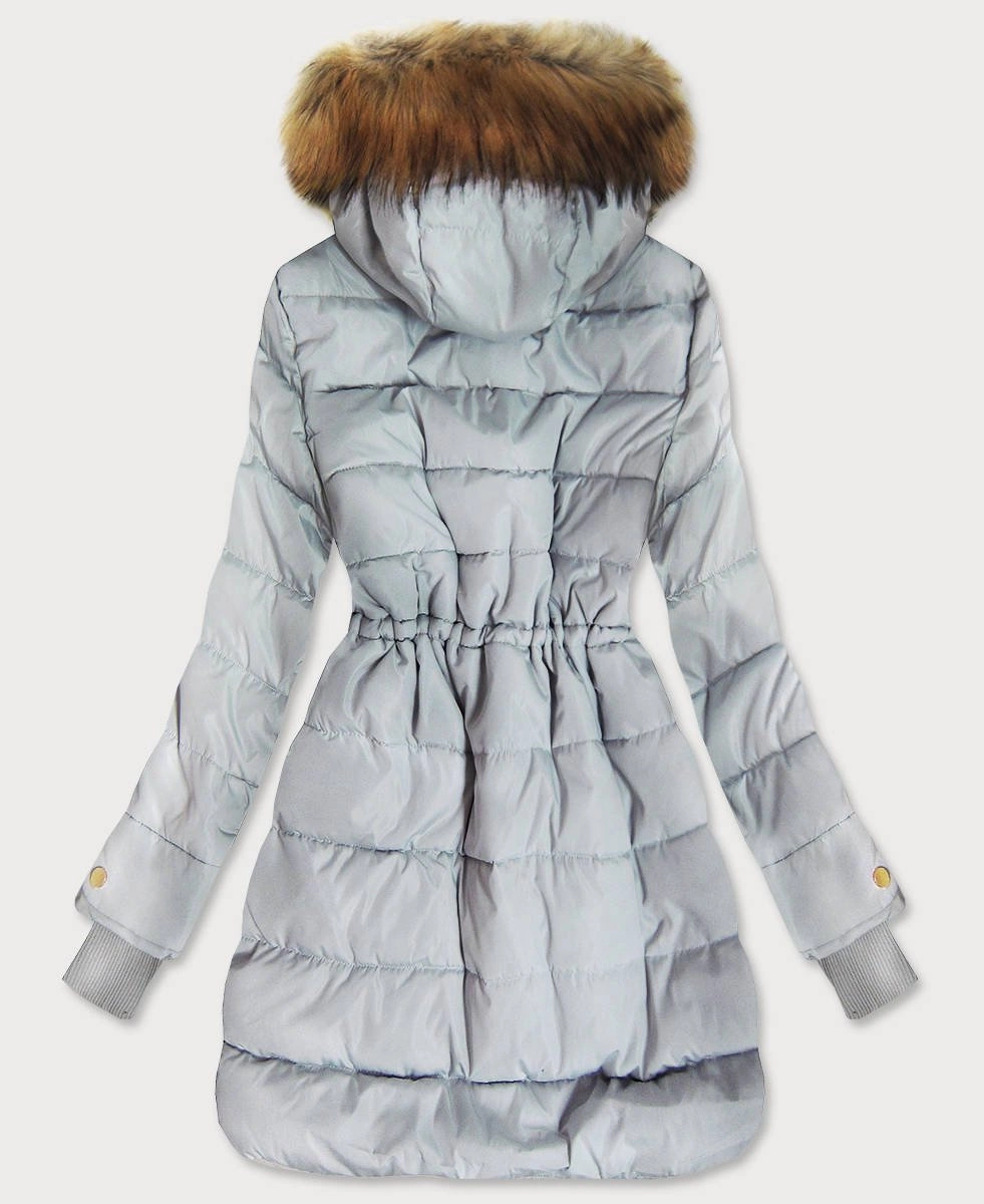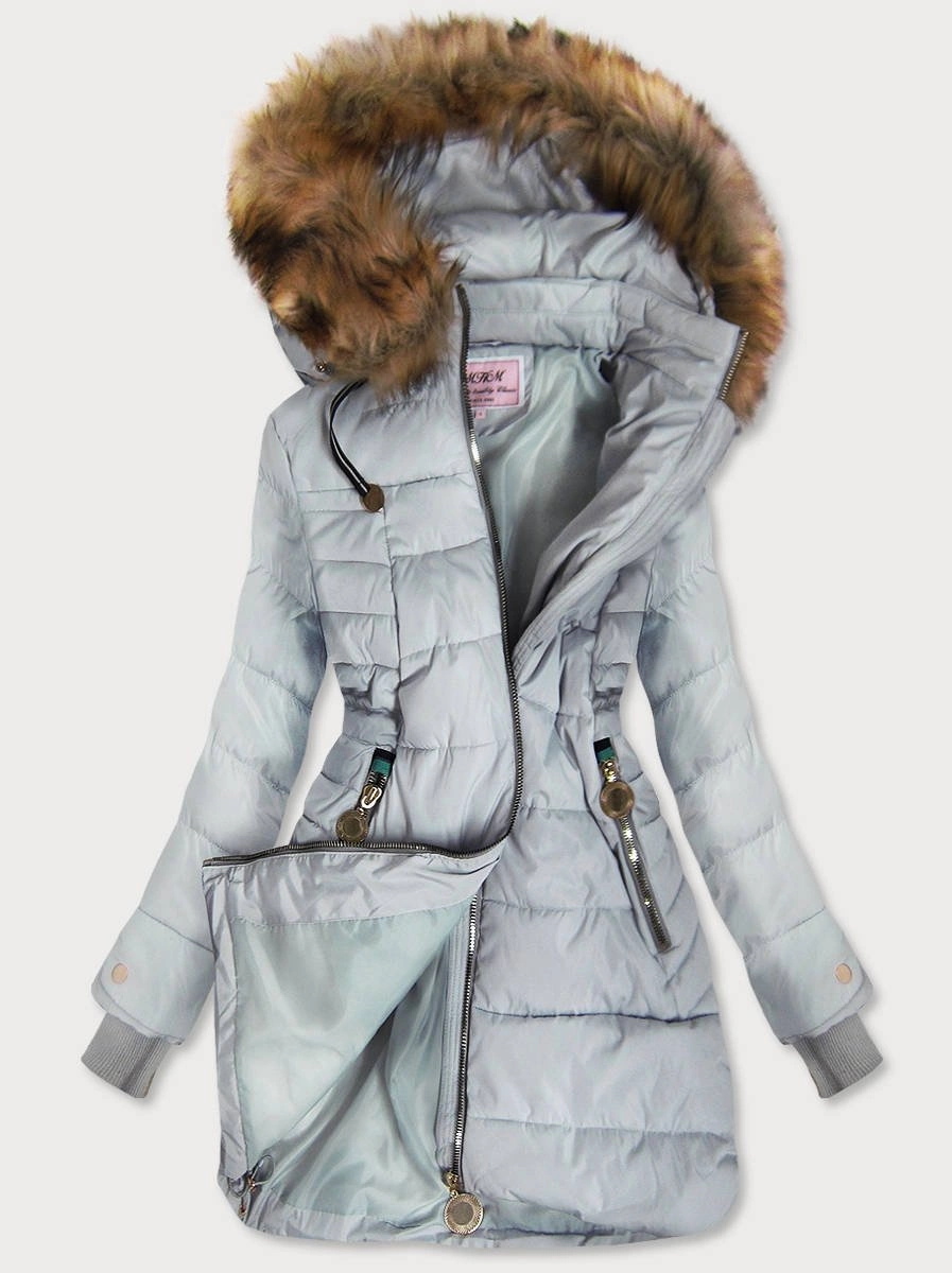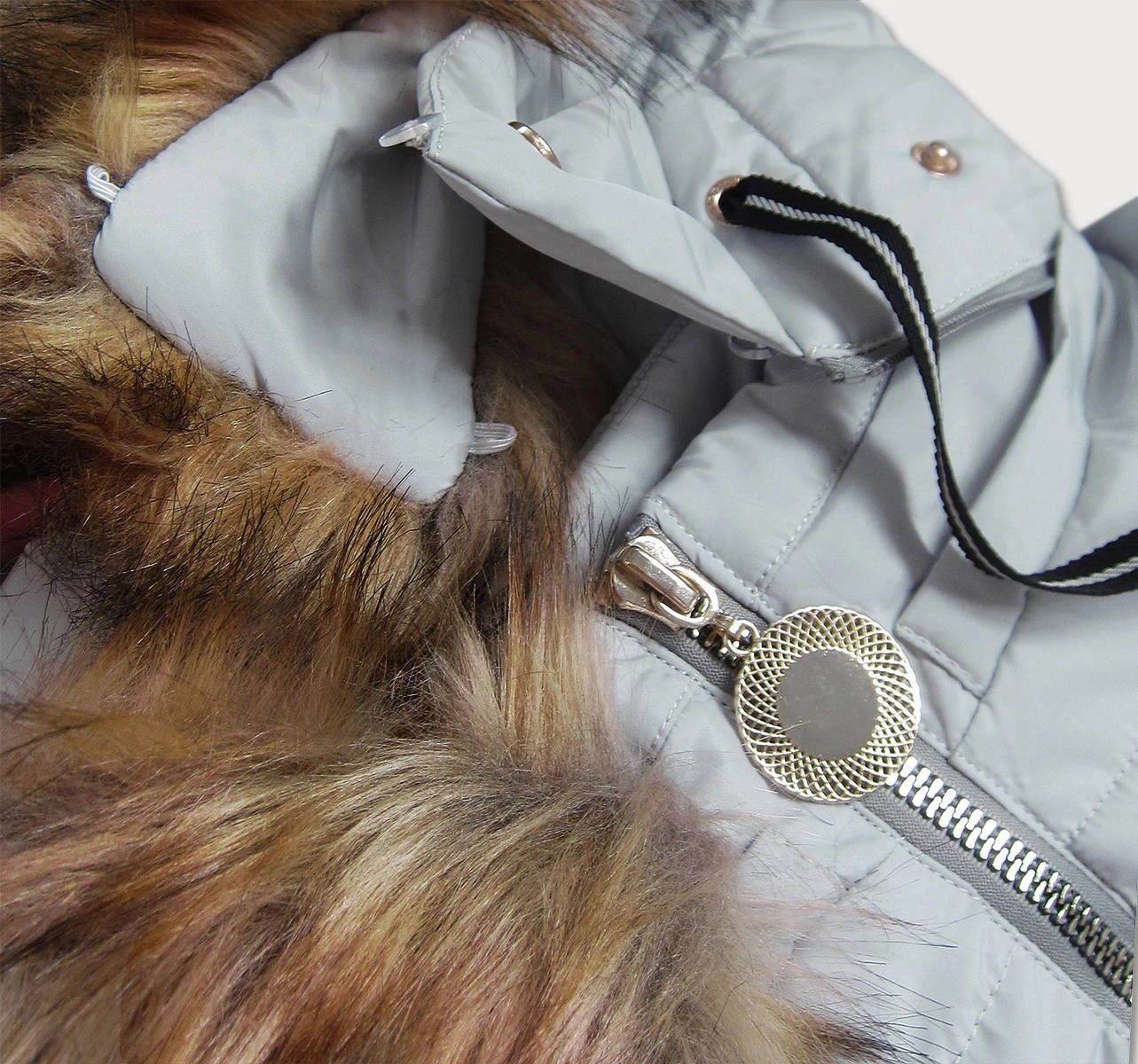 PIKOWANA KURTKA DAMSKA ZIMOWA Z KAPTUREM SZAROMIĘTOWA (W721)